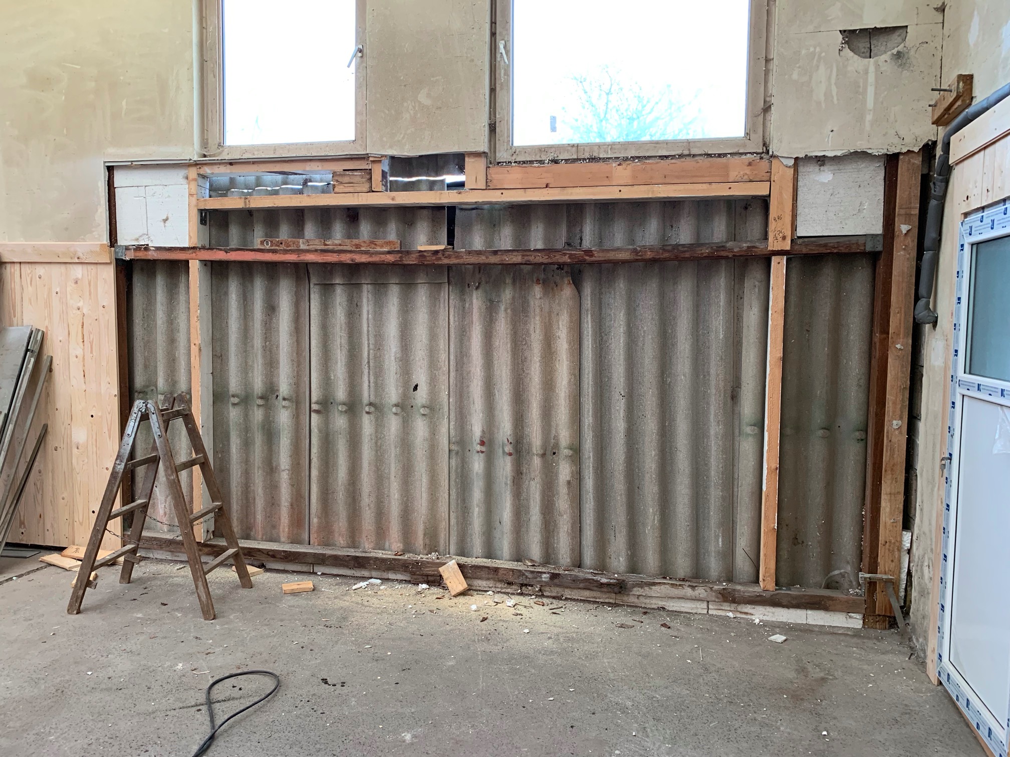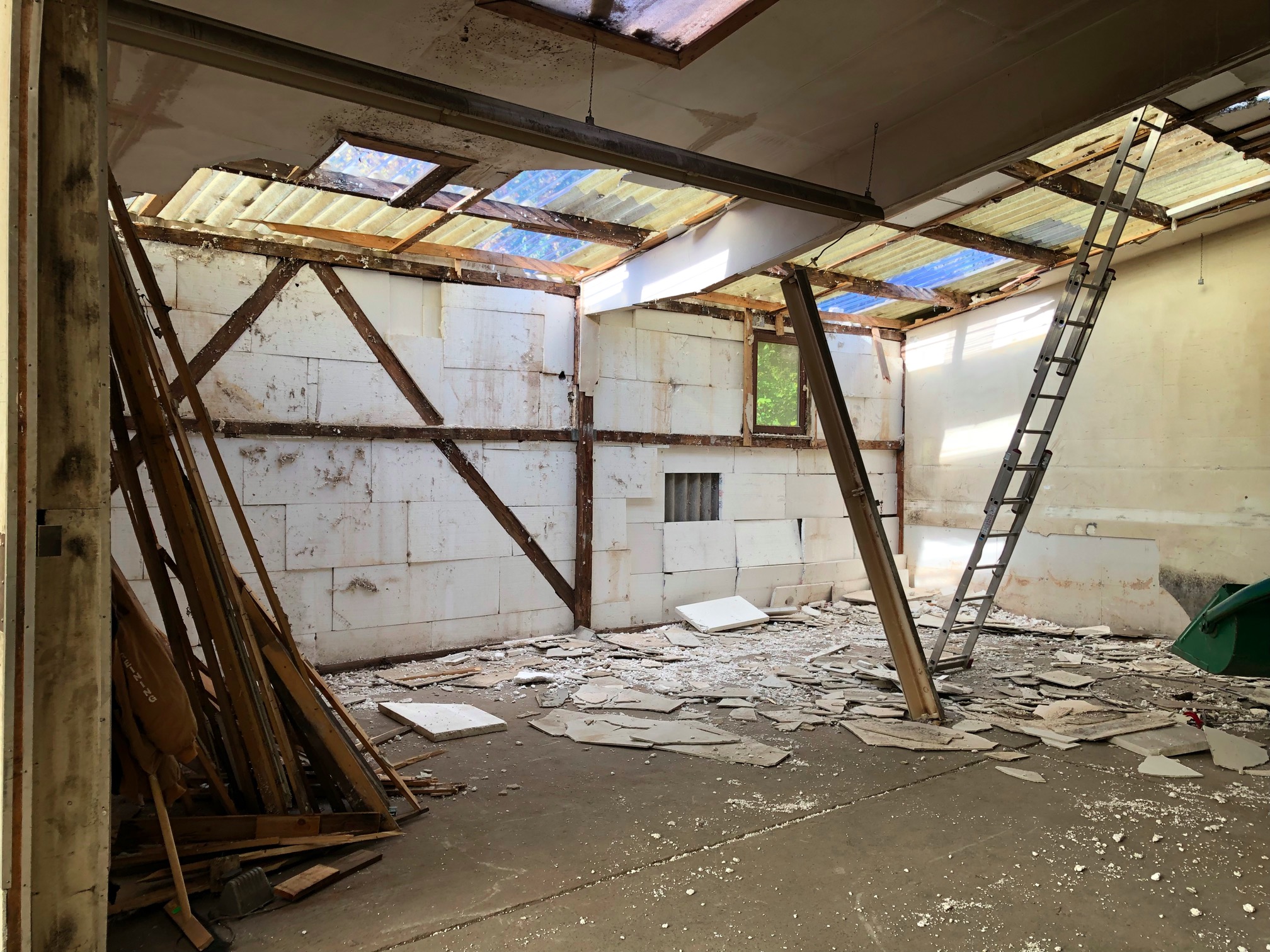 Der schlußendliche Rest wird abgebaut, die Deckenverkleidung mit doppelten Fermacellplatten heruntergenommen, die restliche Holzverschalung dem Holzcontainer zugeführt und das (hoffentlich) letzte Altmetall für den Schrotti bereitgestellt;