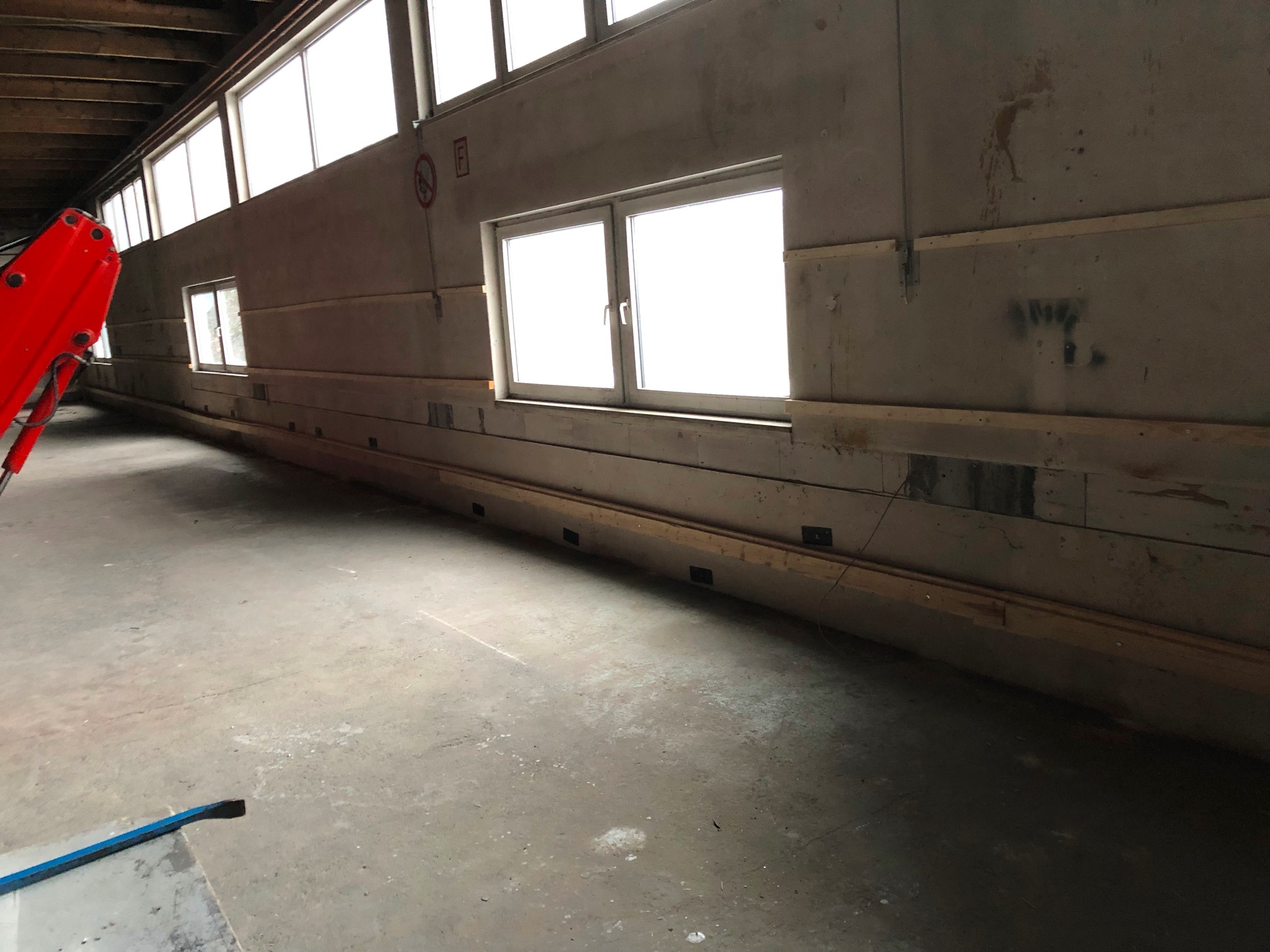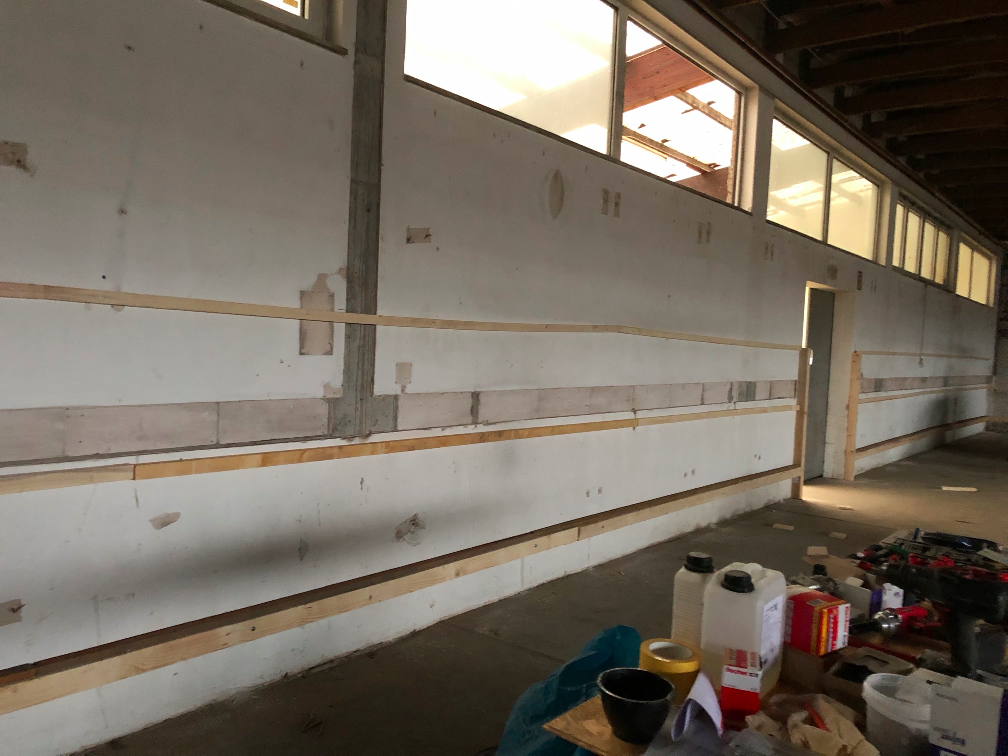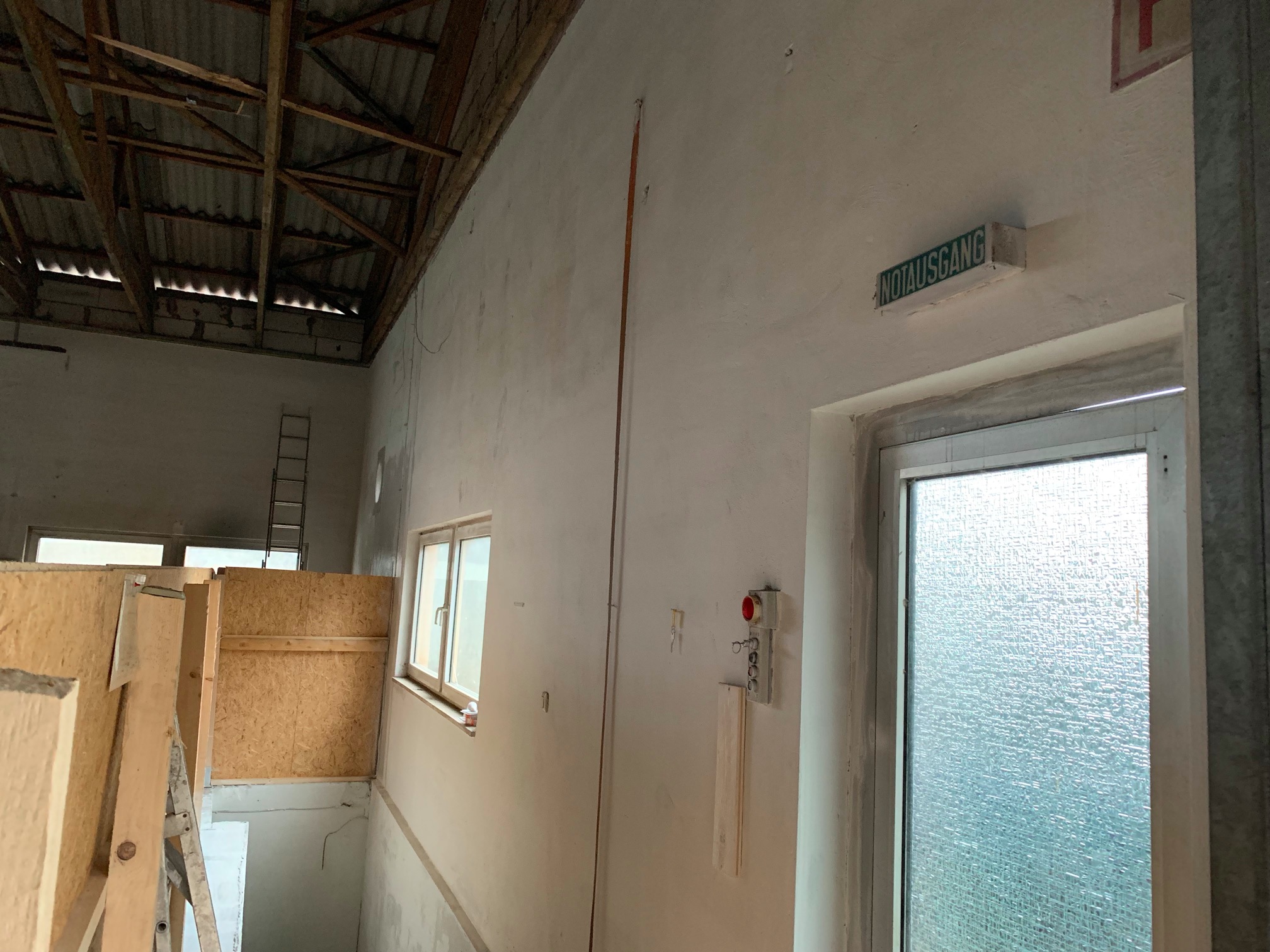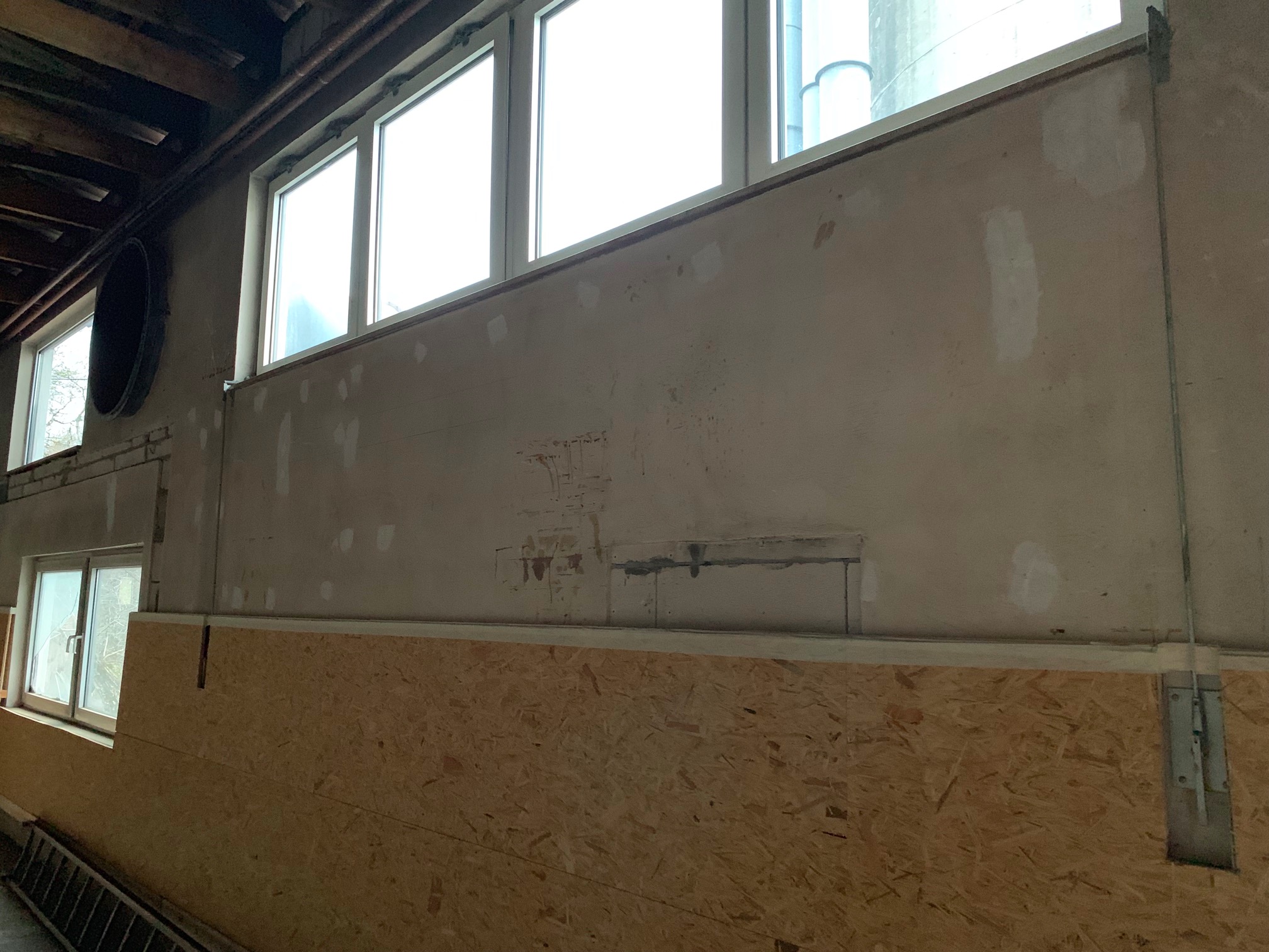 Der Abbruch der ehemaligen Spritzkammer (rechts neben dem Eingang) ist dann ebenfalls nicht mal eben so zu machen - schließlich muss in einer Höhe von 6 m gearbeitet werden (und ja, ich habe Höhenangst) und ... es kommt wie es kommen musste - falle von der Leiter: glücklicherweise ist nicht viel passiert - nur ein paar Prellungen. Spritzkammer ist weg und zudem haben wir alle Heizungen auf dieser Seite (eh nutzlos, da die Heizanlage seit Jahren defekt ist und für die Reit-/Bewegungshalle nicht benötigt wird) abgebaut und noch die Deckenkabeltrasse auf dieser Seite demontiert -> es geht vorwärts