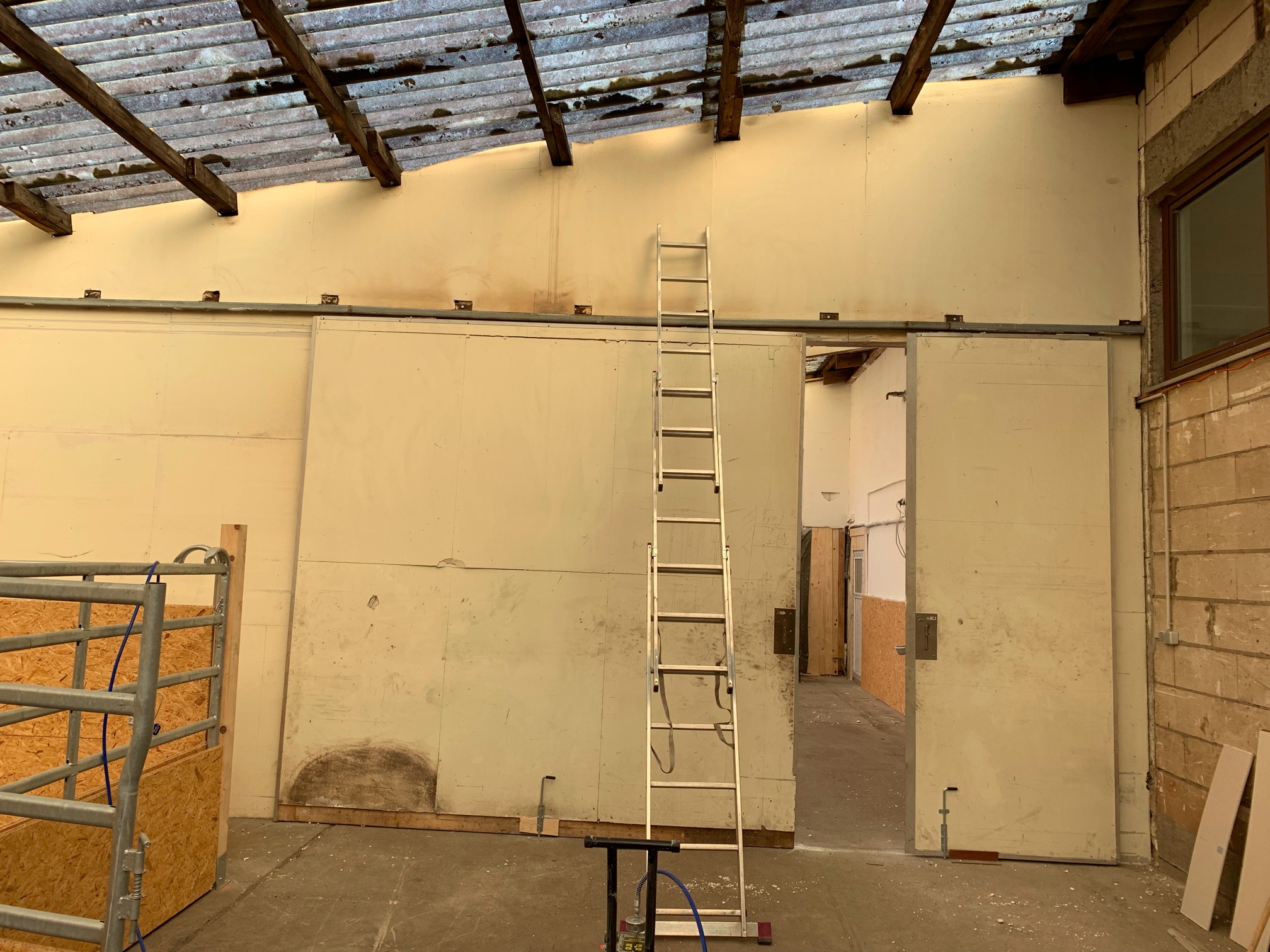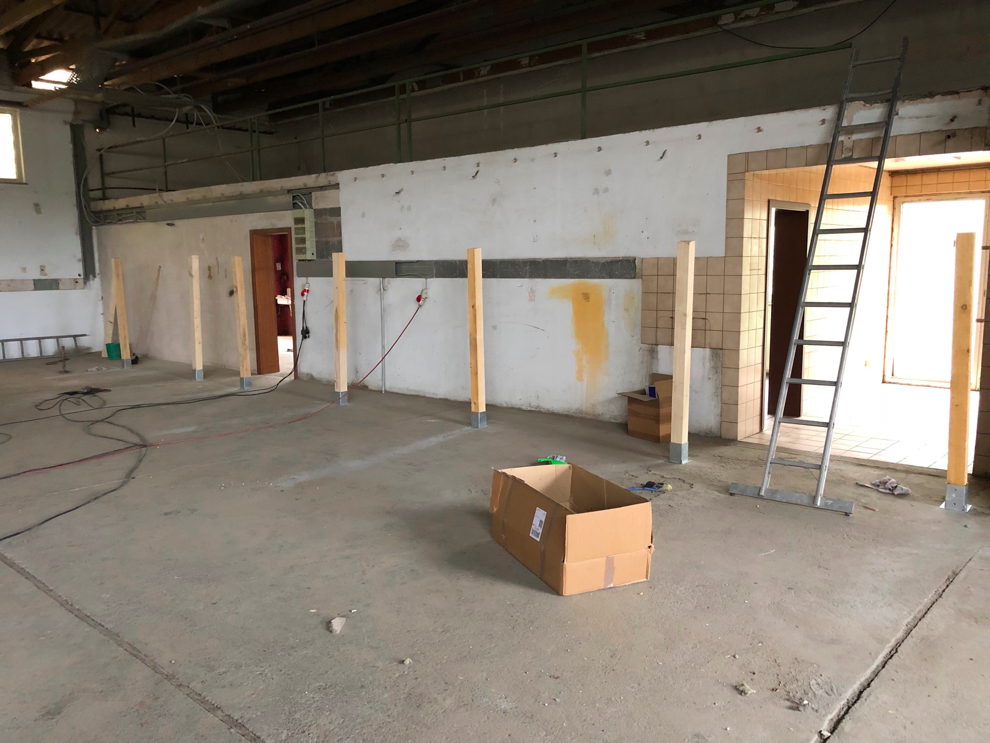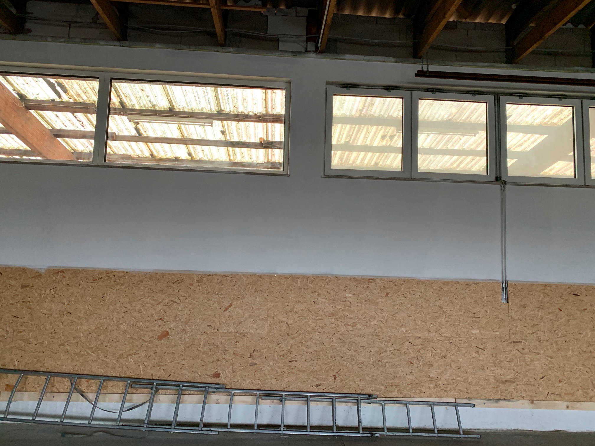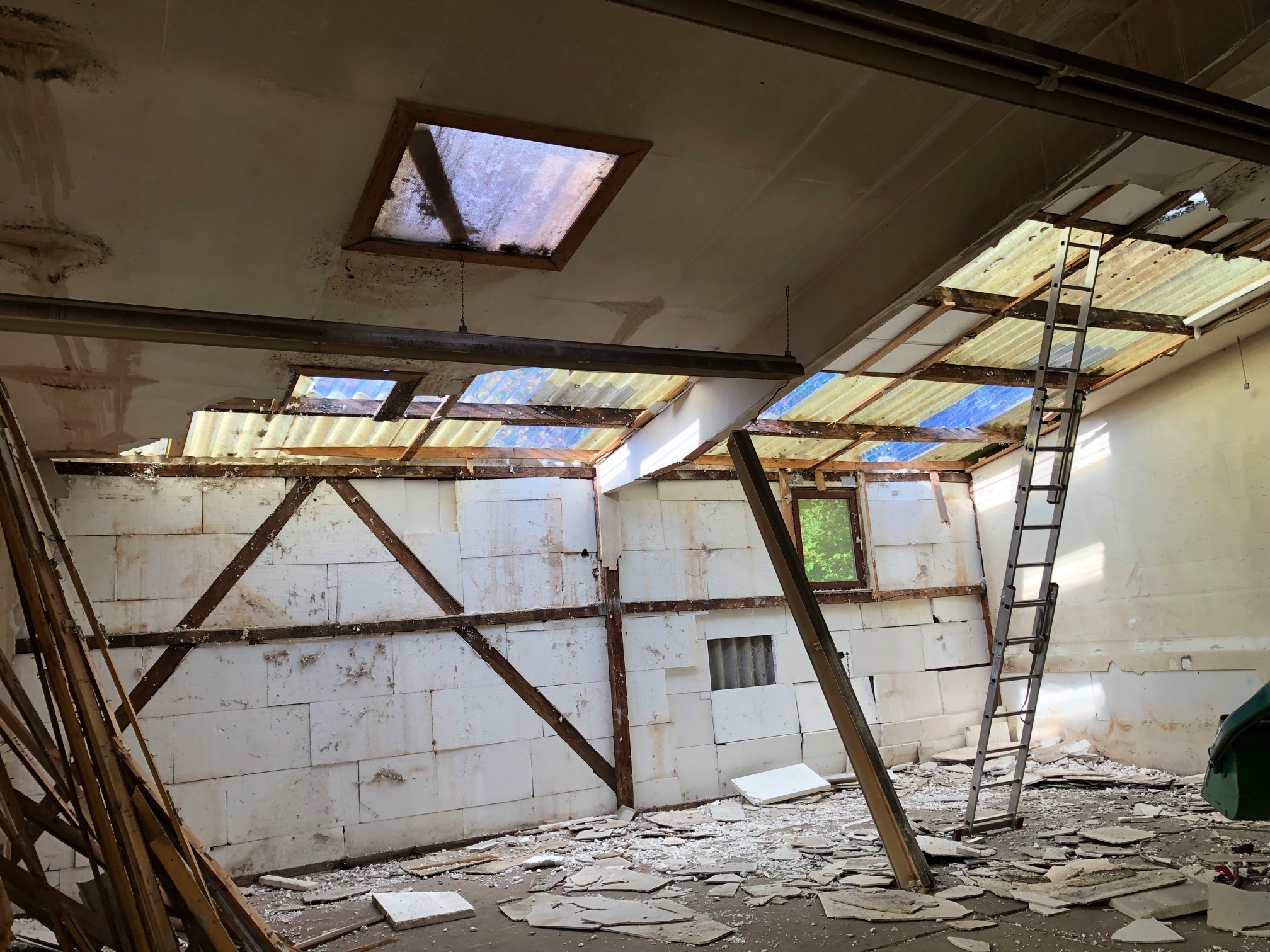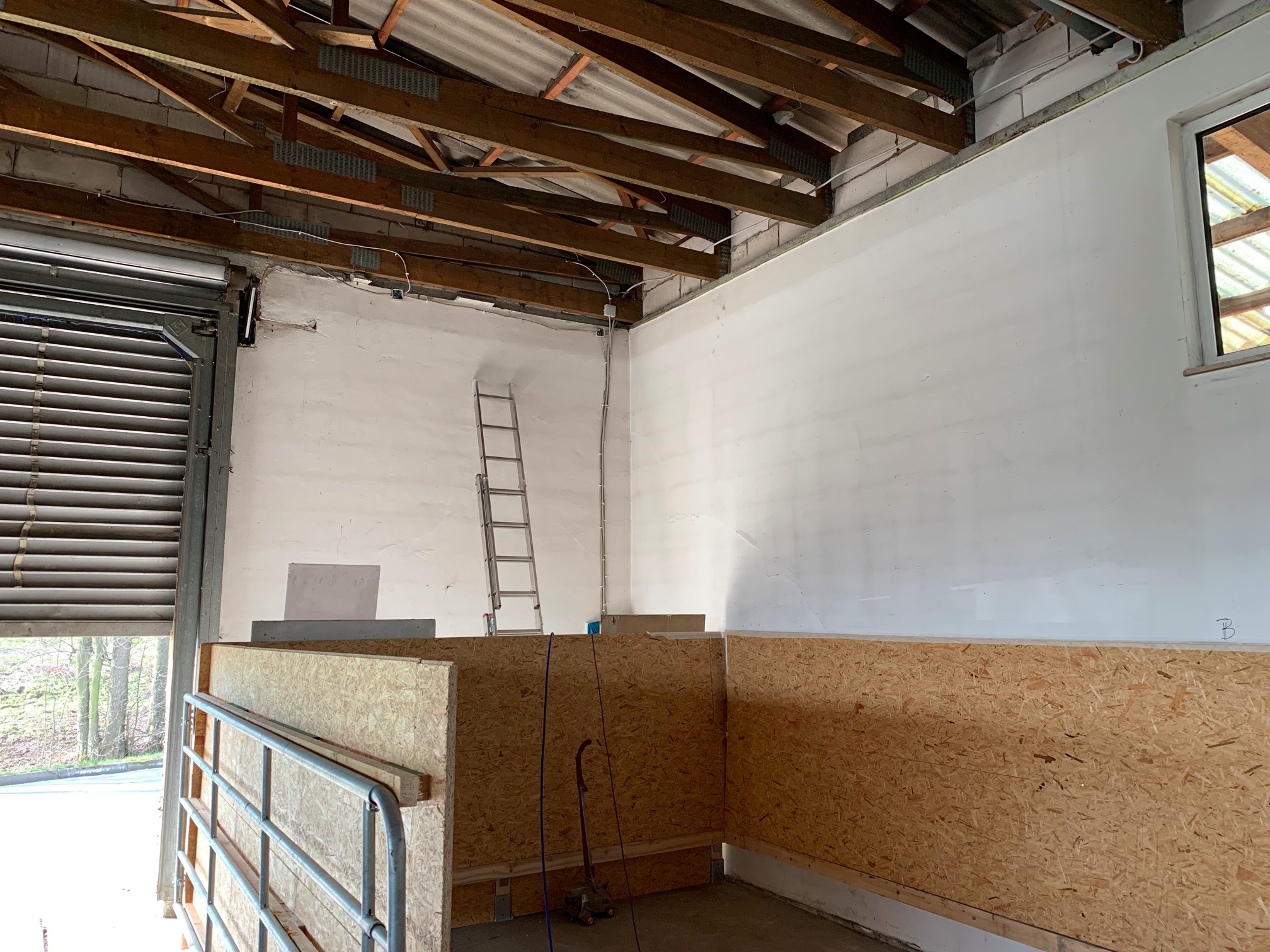 Der Abbruch der ehemaligen Spritzkammer (rechts neben dem Eingang) ist dann ebenfalls nicht mal eben so zu machen - schließlich muss in einer Höhe von 6 m gearbeitet werden (und ja, ich habe Höhenangst) und ... es kommt wie es kommen musste - falle von der Leiter: glücklicherweise ist nicht viel passiert - nur ein paar Prellungen. Spritzkammer ist weg und zudem haben wir alle Heizungen auf dieser Seite (eh nutzlos, da die Heizanlage seit Jahren defekt ist und für die Reit-/Bewegungshalle nicht benötigt wird) abgebaut und noch die Deckenkabeltrasse auf dieser Seite demontiert -> es geht vorwärts