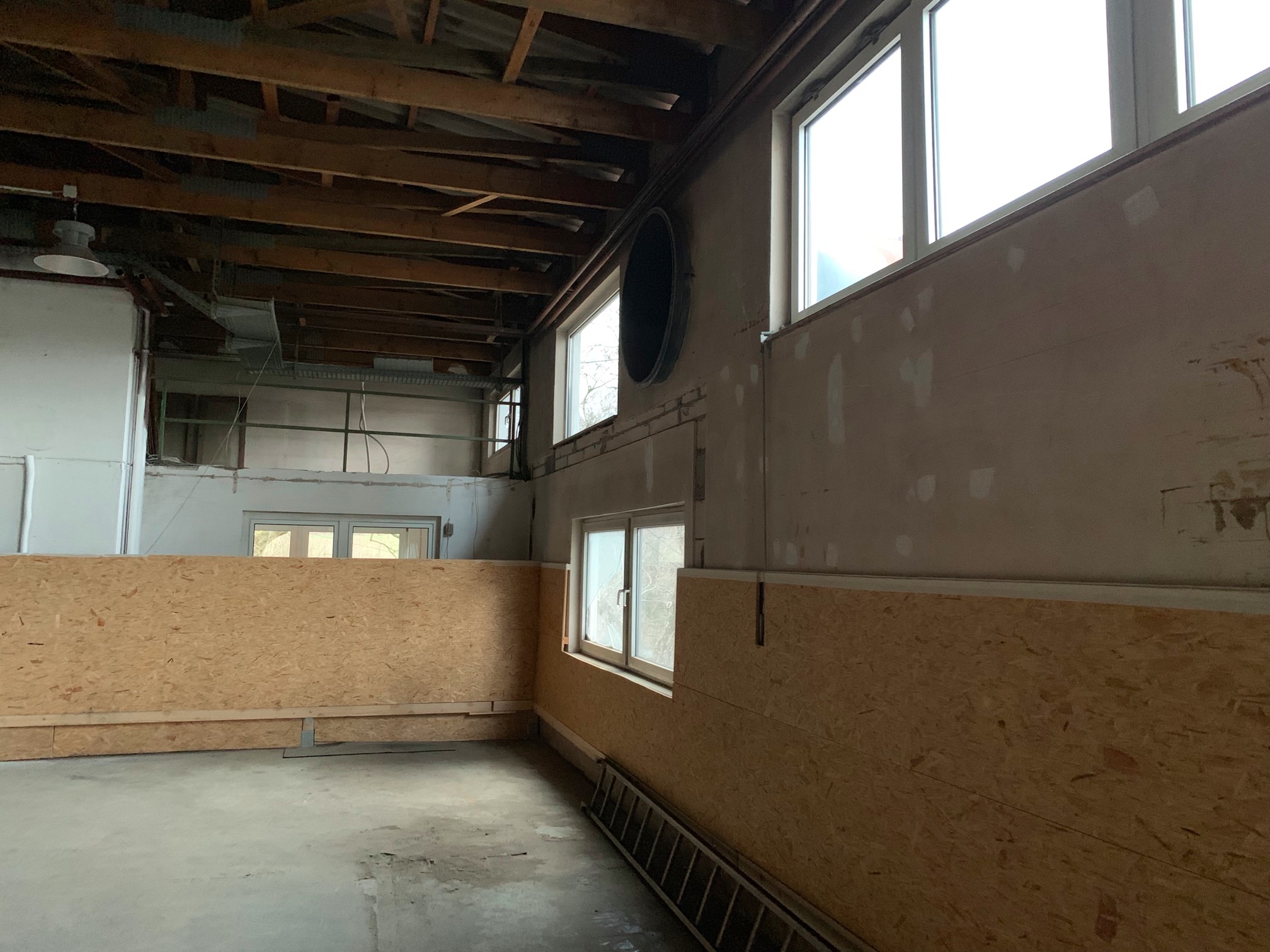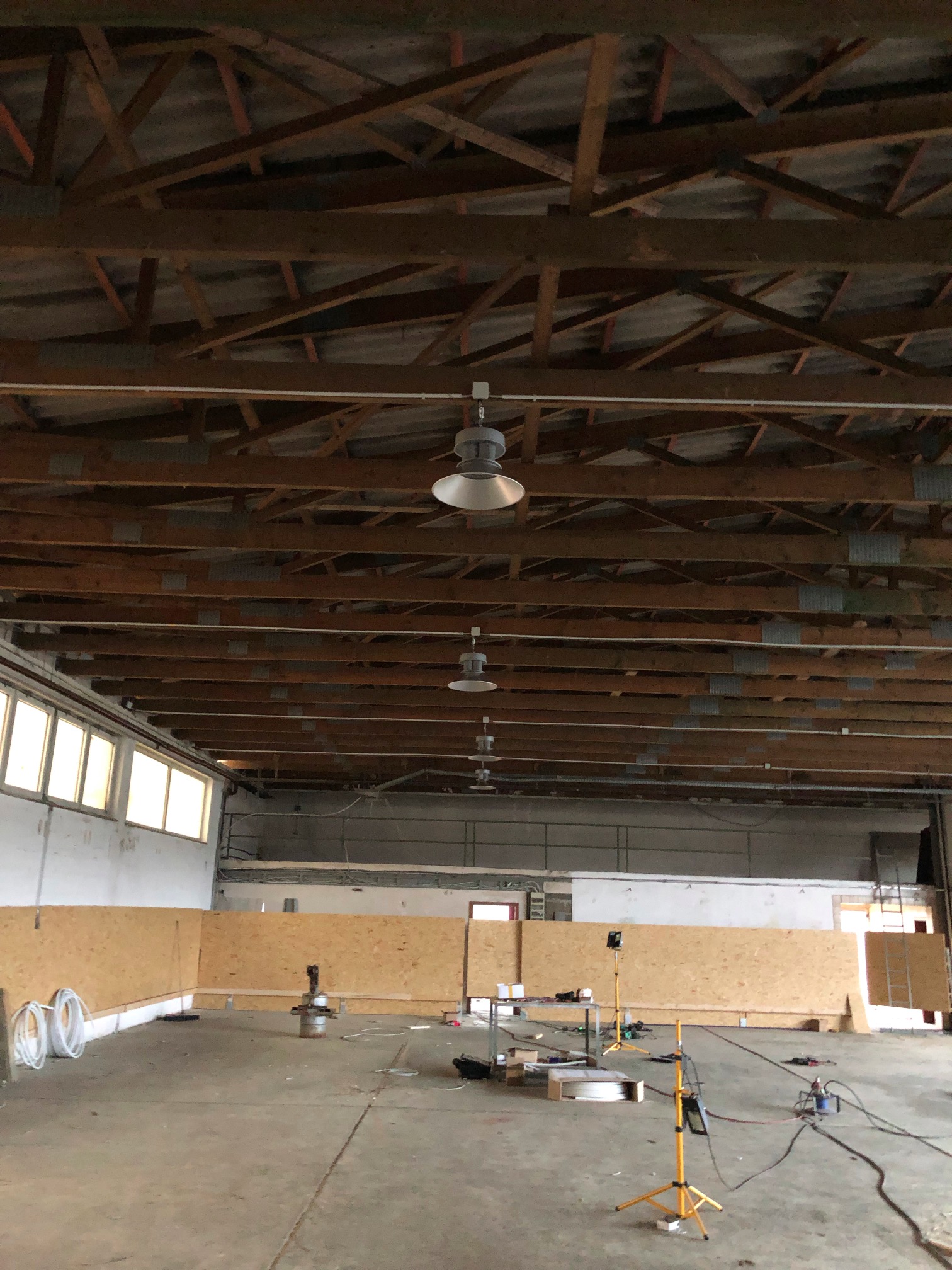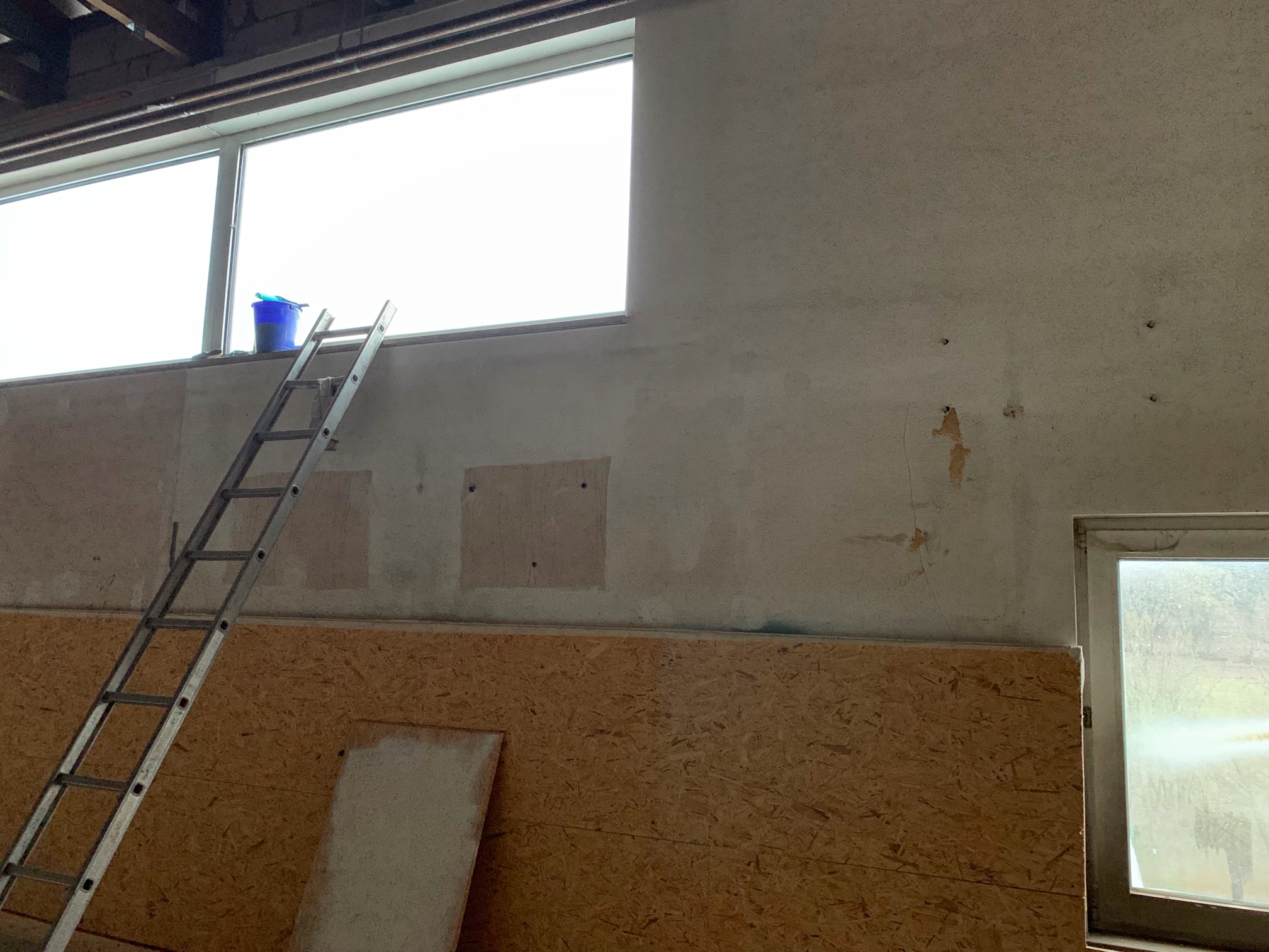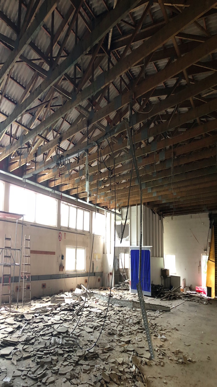 Der Abbruch der ehemaligen Spritzkammer (rechts neben dem Eingang) ist dann ebenfalls nicht mal eben so zu machen - schließlich muss in einer Höhe von 6 m gearbeitet werden (und ja, ich habe Höhenangst) und ... es kommt wie es kommen musste - falle von der Leiter: glücklicherweise ist nicht viel passiert - nur ein paar Prellungen. Spritzkammer ist weg und zudem haben wir alle Heizungen auf dieser Seite (eh nutzlos, da die Heizanlage seit Jahren defekt ist und für die Reit-/Bewegungshalle nicht benötigt wird) abgebaut und noch die Deckenkabeltrasse auf dieser Seite demontiert -> es geht vorwärts