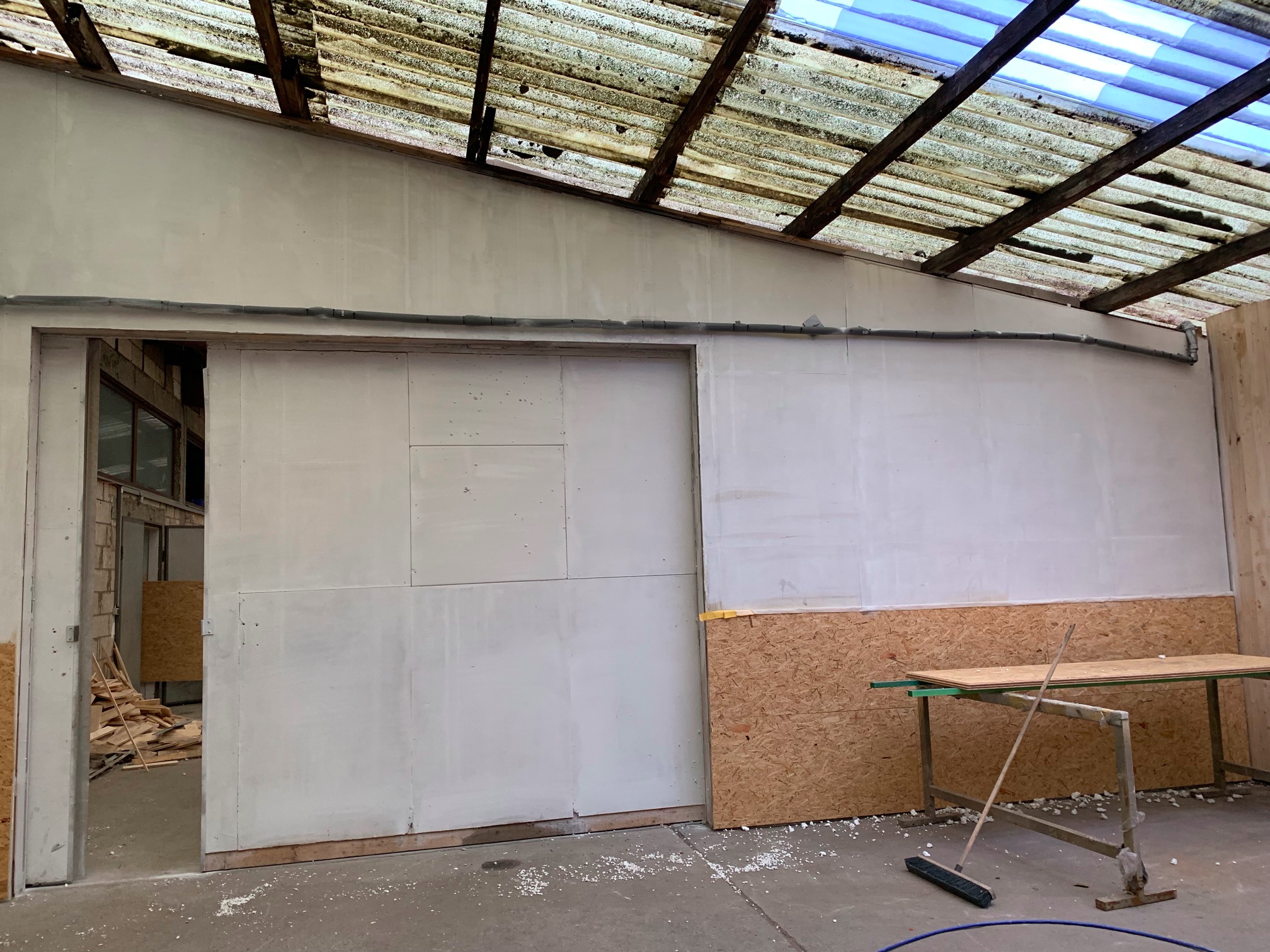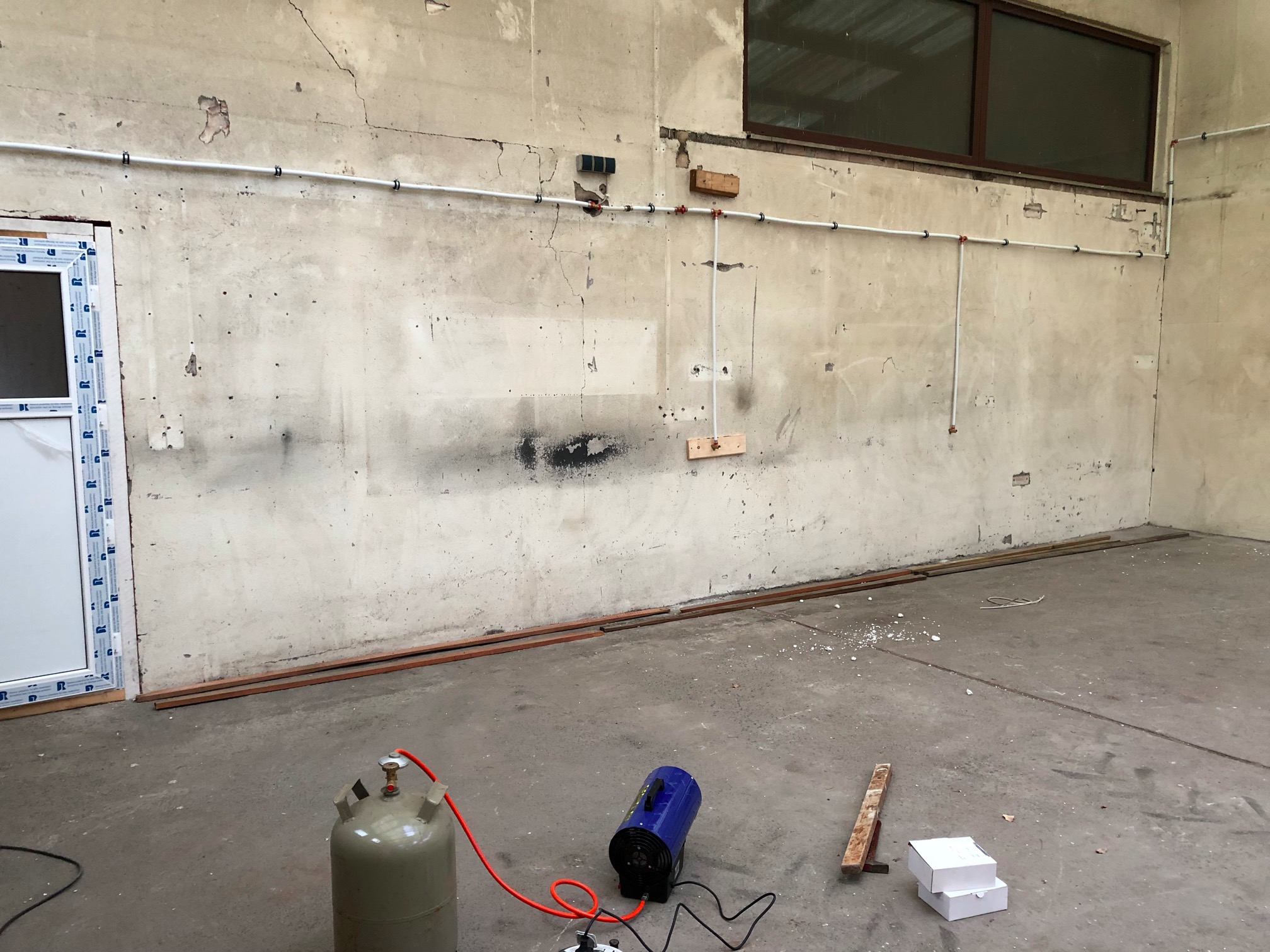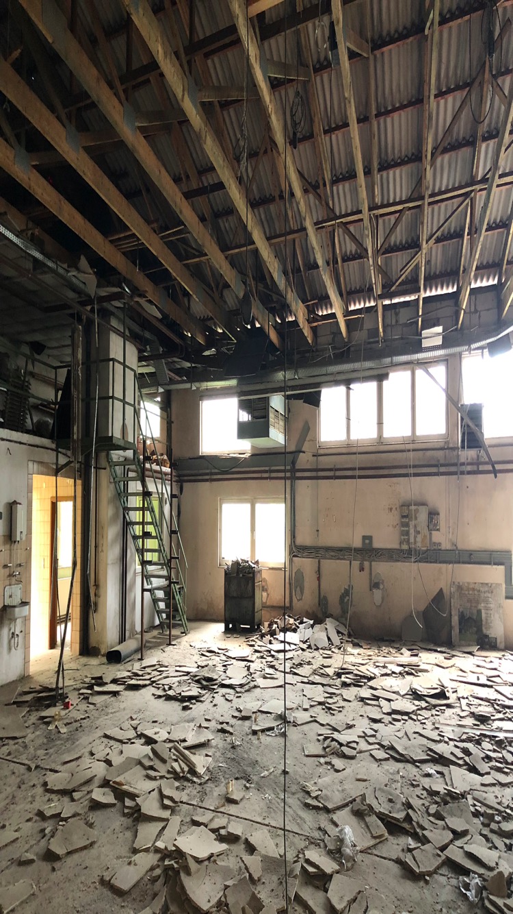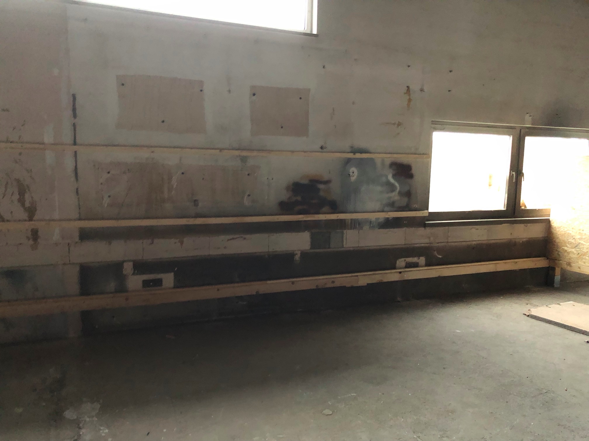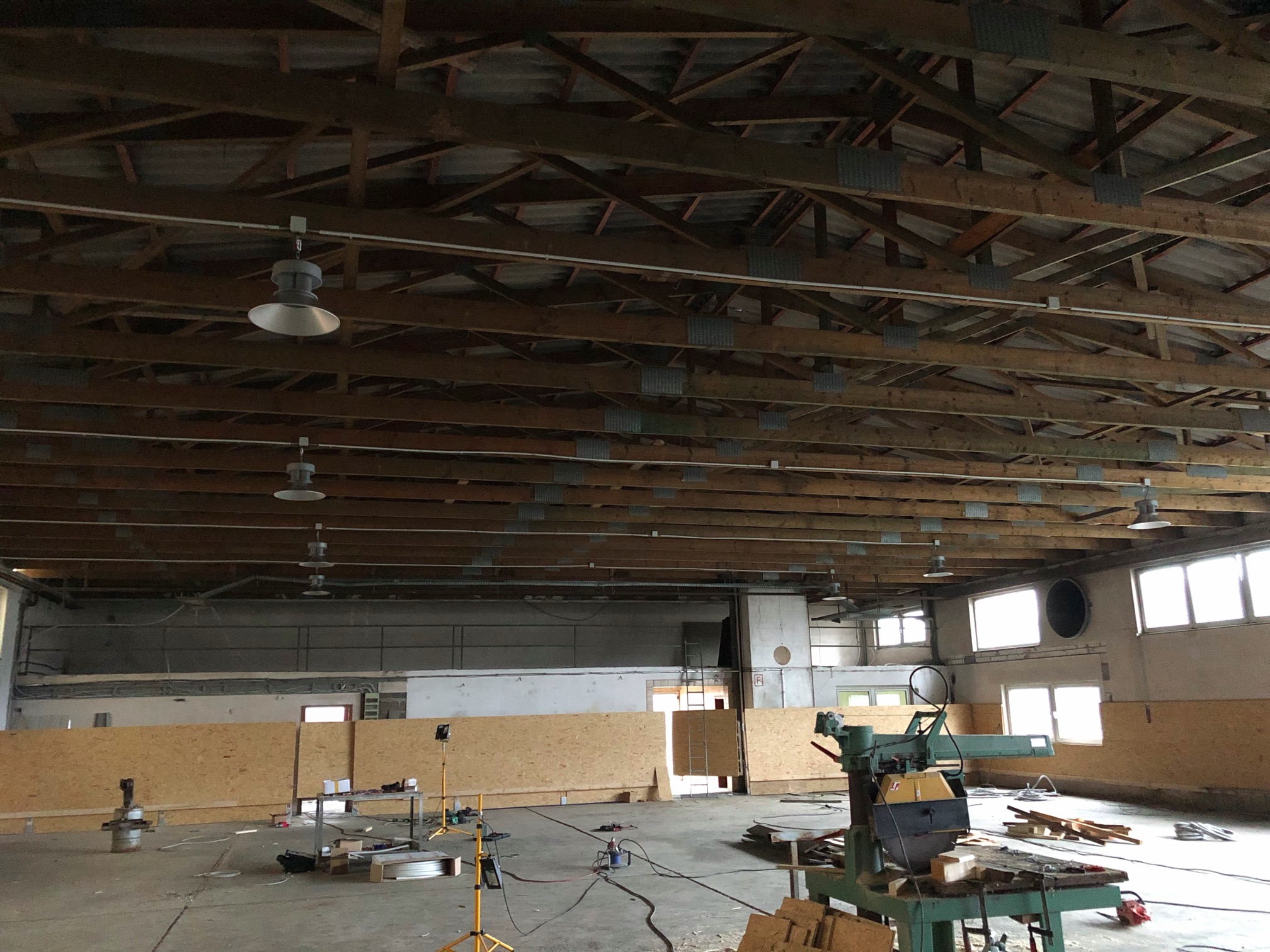 Der Abbruch der ehemaligen Spritzkammer (rechts neben dem Eingang) ist dann ebenfalls nicht mal eben so zu machen - schließlich muss in einer Höhe von 6 m gearbeitet werden (und ja, ich habe Höhenangst) und ... es kommt wie es kommen musste - falle von der Leiter: glücklicherweise ist nicht viel passiert - nur ein paar Prellungen. Spritzkammer ist weg und zudem haben wir alle Heizungen auf dieser Seite (eh nutzlos, da die Heizanlage seit Jahren defekt ist und für die Reit-/Bewegungshalle nicht benötigt wird) abgebaut und noch die Deckenkabeltrasse auf dieser Seite demontiert -> es geht vorwärts