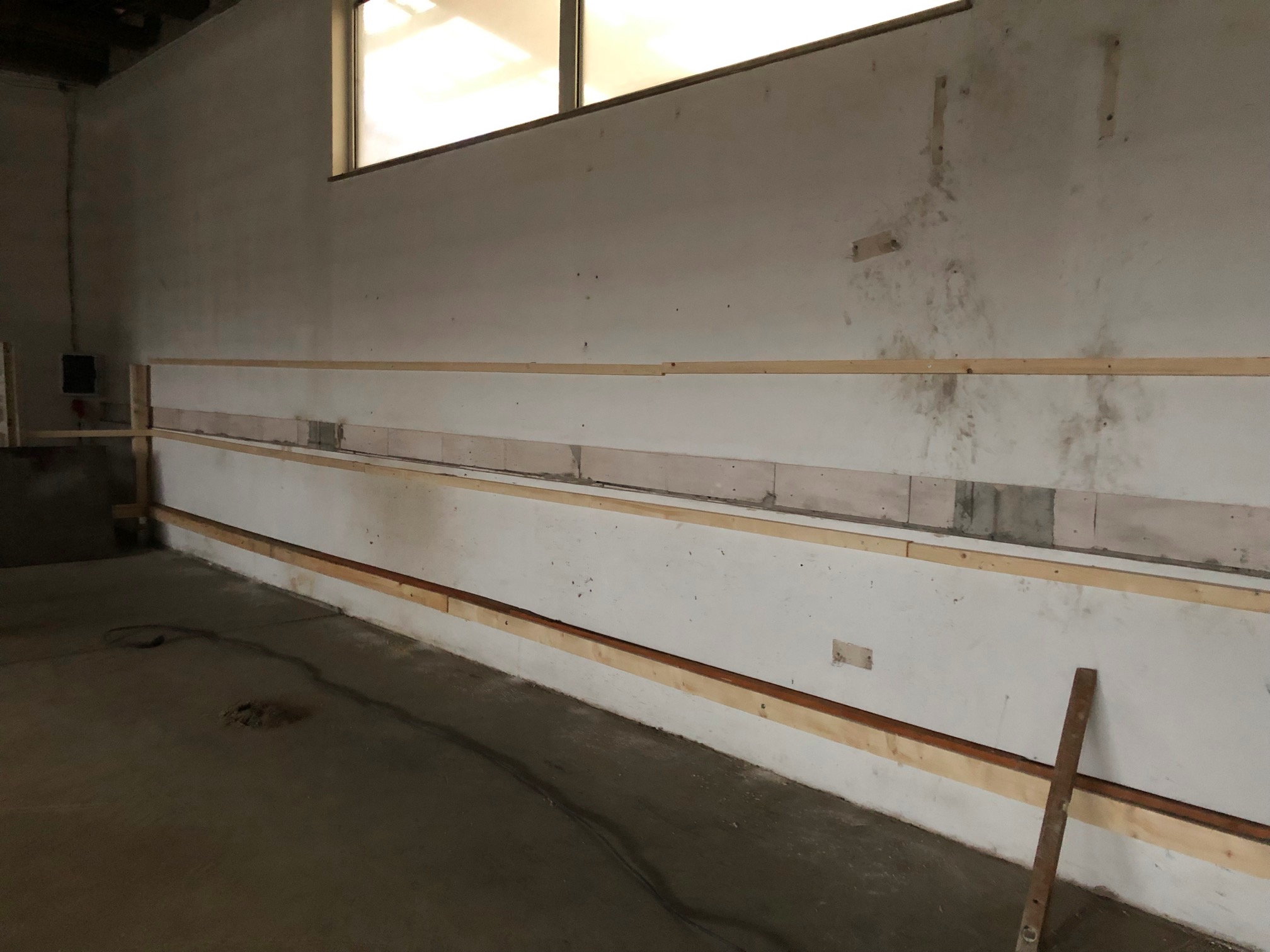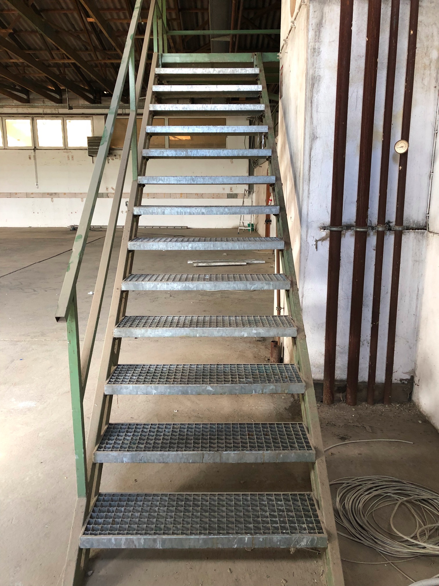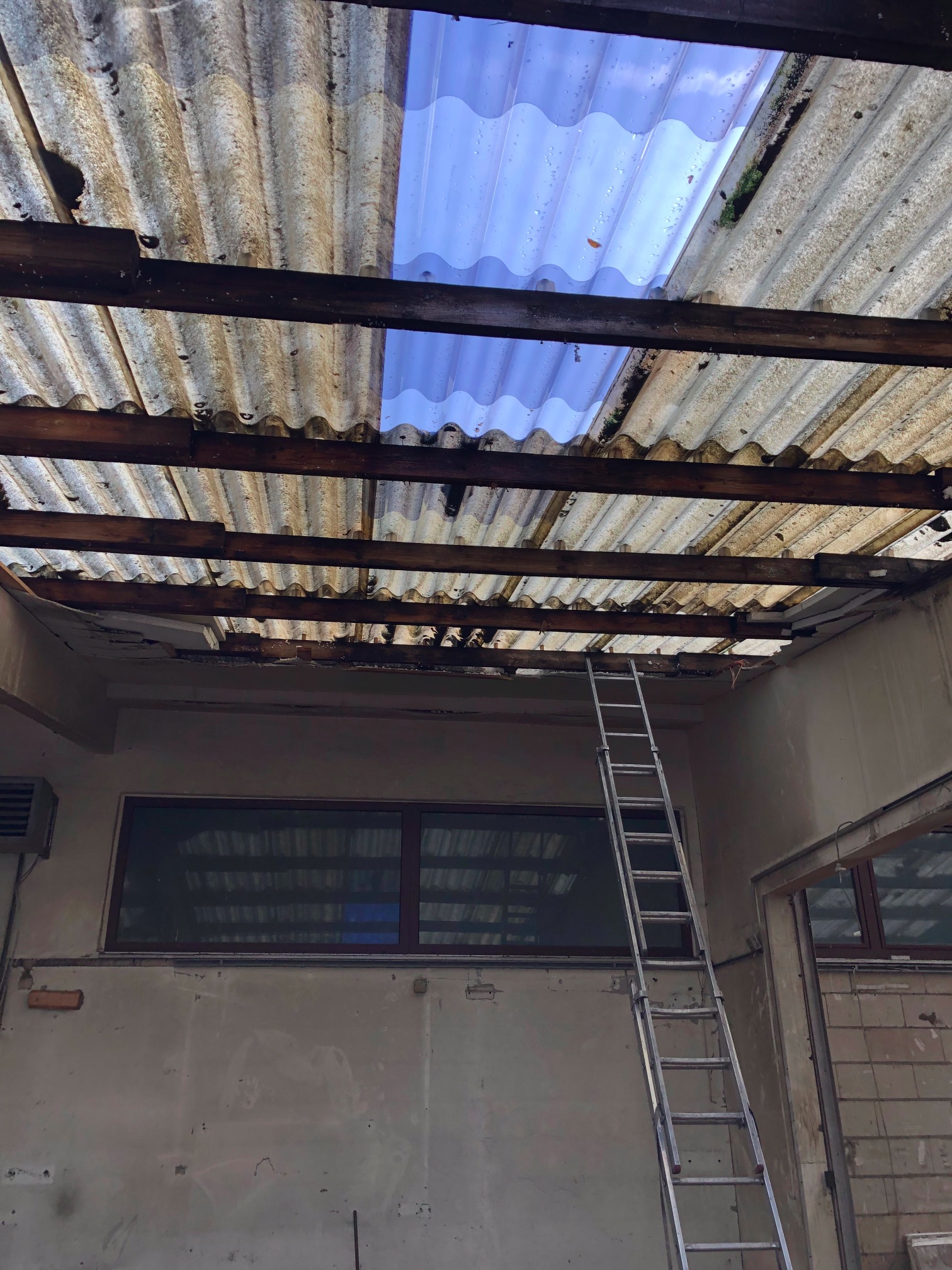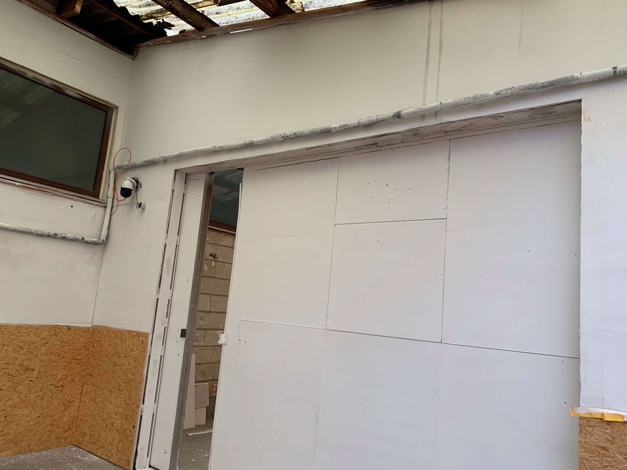Der Abbruch der ehemaligen Spritzkammer (rechts neben dem Eingang) ist dann ebenfalls nicht mal eben so zu machen - schließlich muss in einer Höhe von 6 m gearbeitet werden (und ja, ich habe Höhenangst) und ... es kommt wie es kommen musste - falle von der Leiter: glücklicherweise ist nicht viel passiert - nur ein paar Prellungen. Spritzkammer ist weg und zudem haben wir alle Heizungen auf dieser Seite (eh nutzlos, da die Heizanlage seit Jahren defekt ist und für die Reit-/Bewegungshalle nicht benötigt wird) abgebaut und noch die Deckenkabeltrasse auf dieser Seite demontiert -> es geht vorwärts