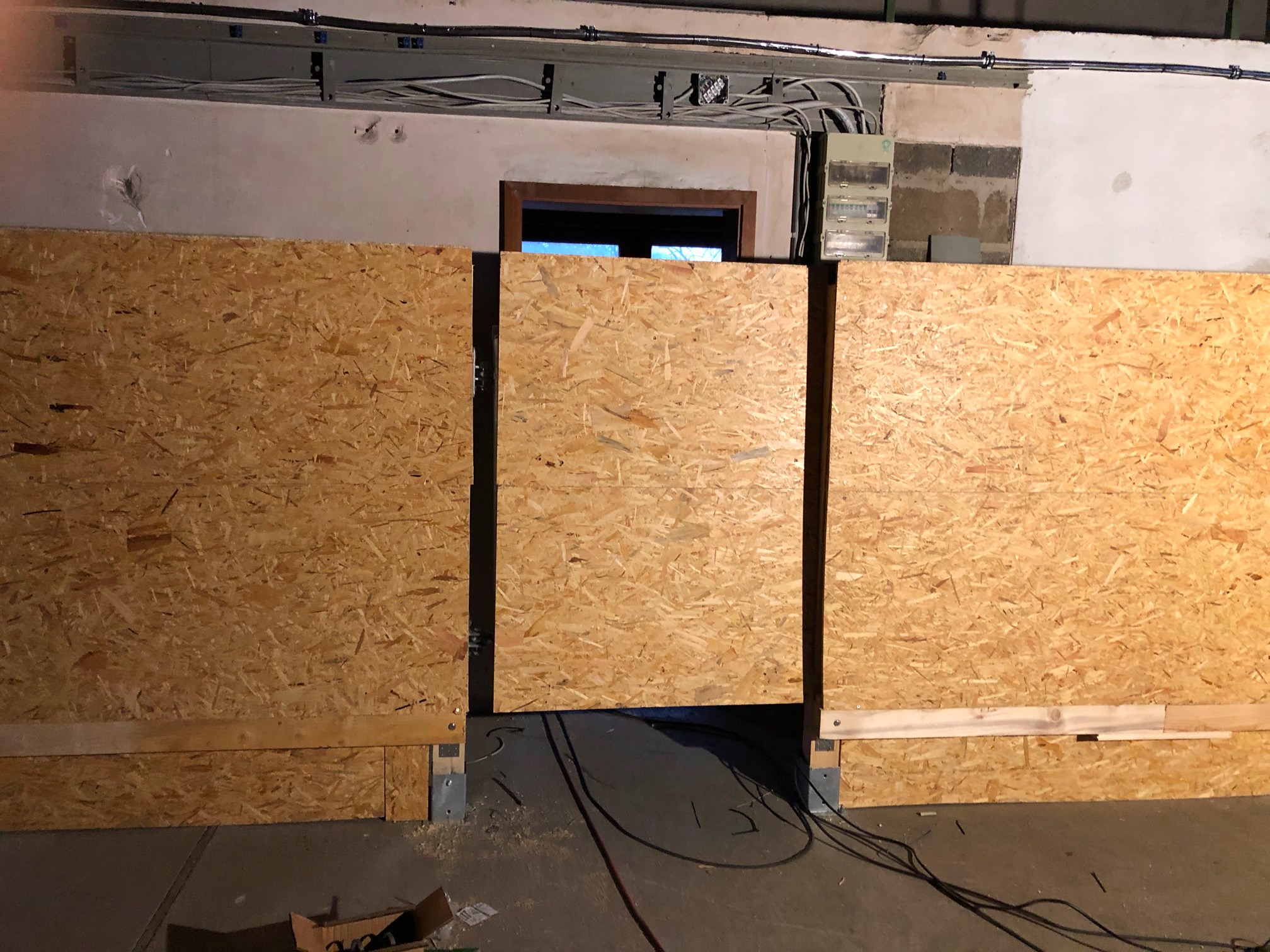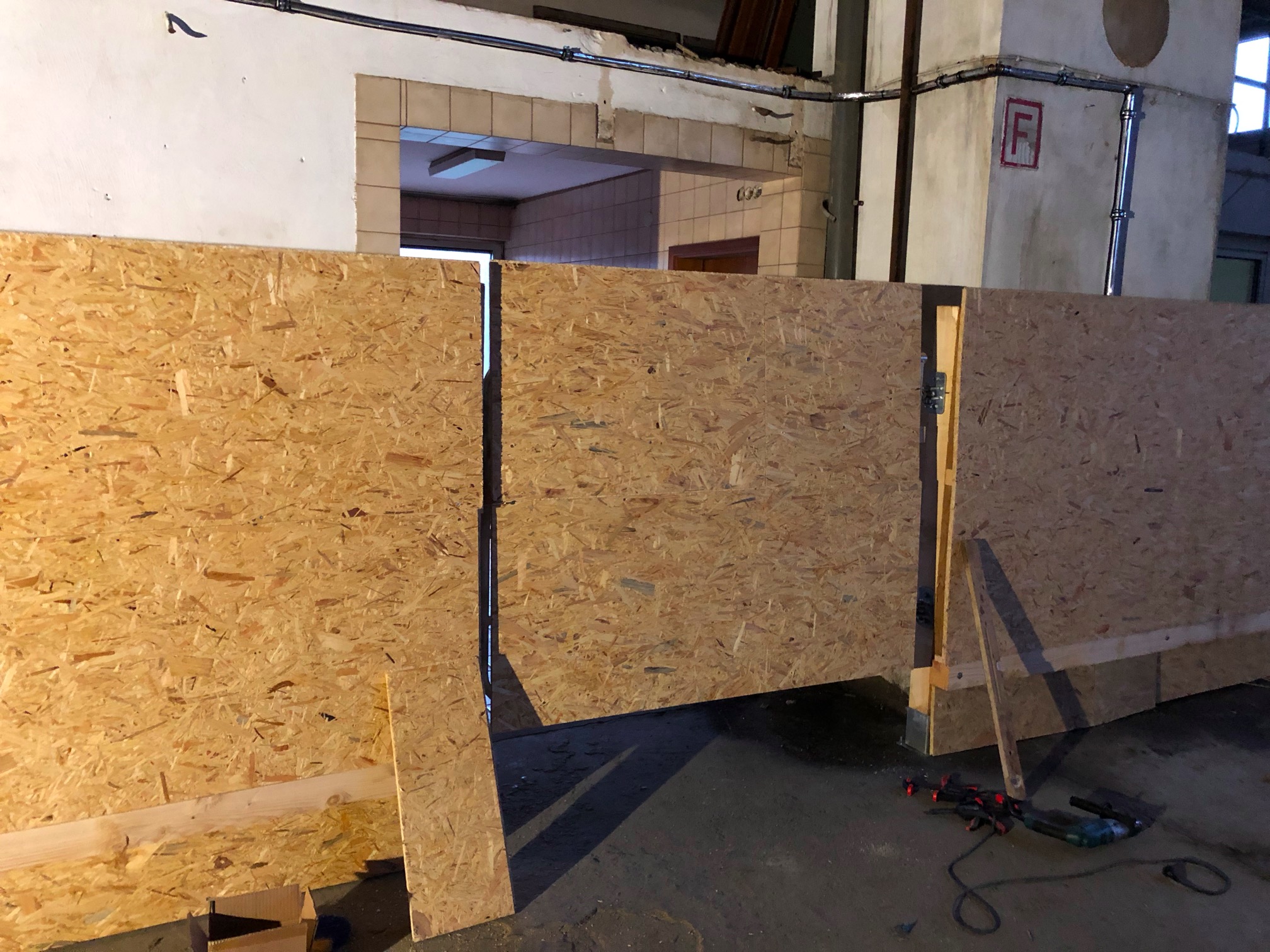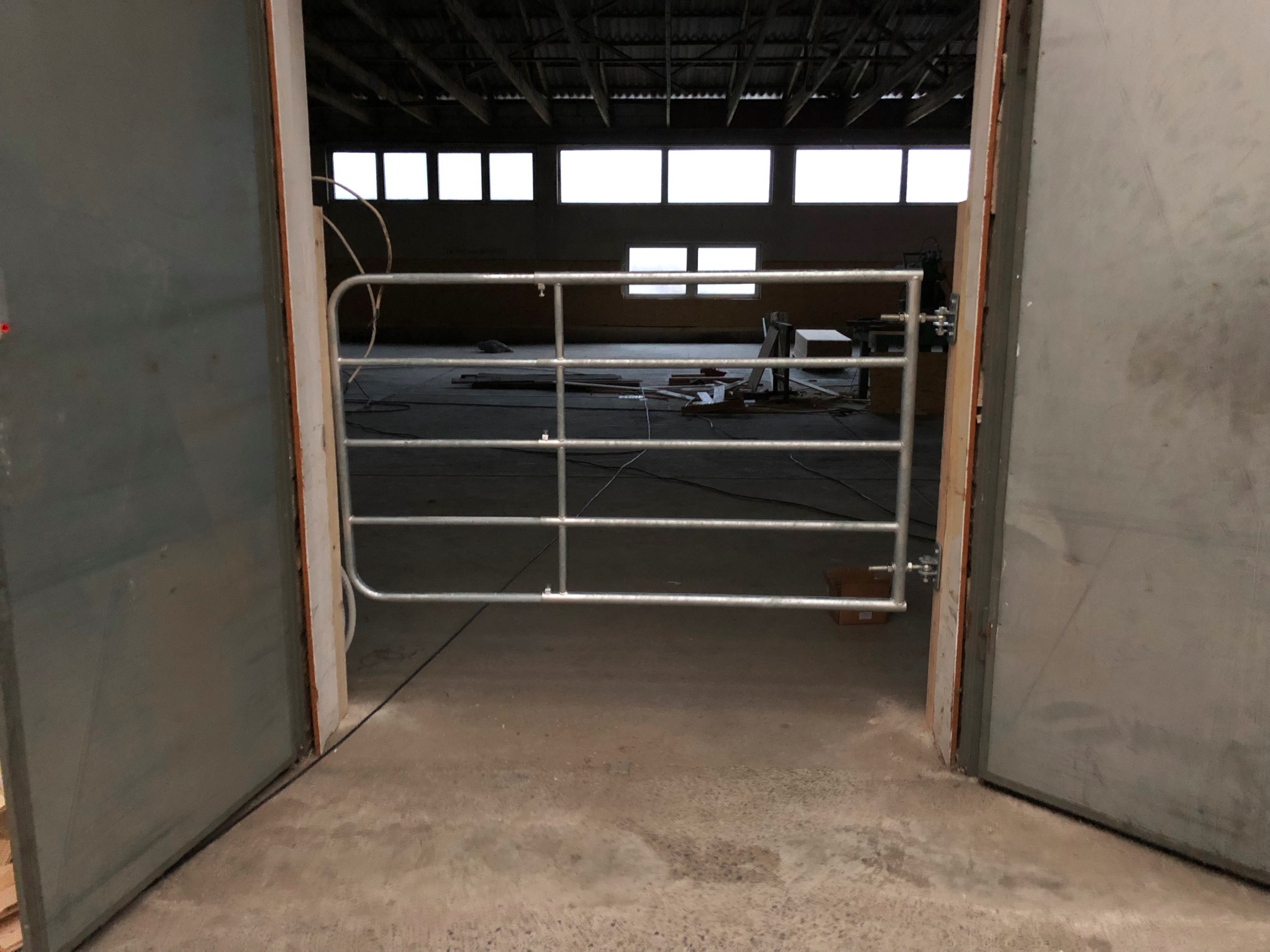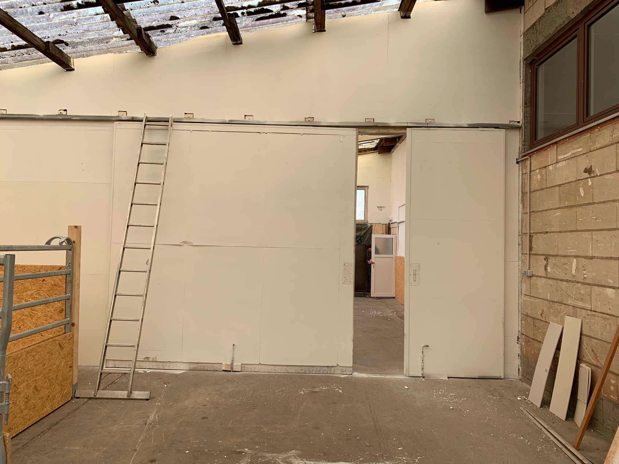 Die noch zu verkleidenden Tore in der Reit-/Bewegungshalle lassen sich recht schnell einbauen - sind ja schließlich Standardteile.