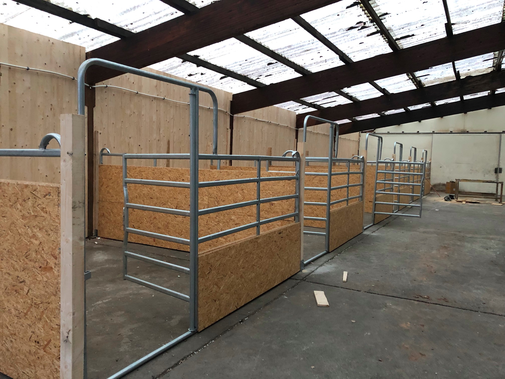 6 schöne Boxen (fast) fertig! Ich glaube, die Pferde werden sich bei einer Boxengröße von 3,70m*4,10m - mithin also 15,17 qm - recht wohl fühlen in ihren hellen, lichtdurchfluteten Boxen. Sie können jederzeit ihre "Mitbewohner" sehen und auch soziale Kontakte pflegen - so soll das sein.