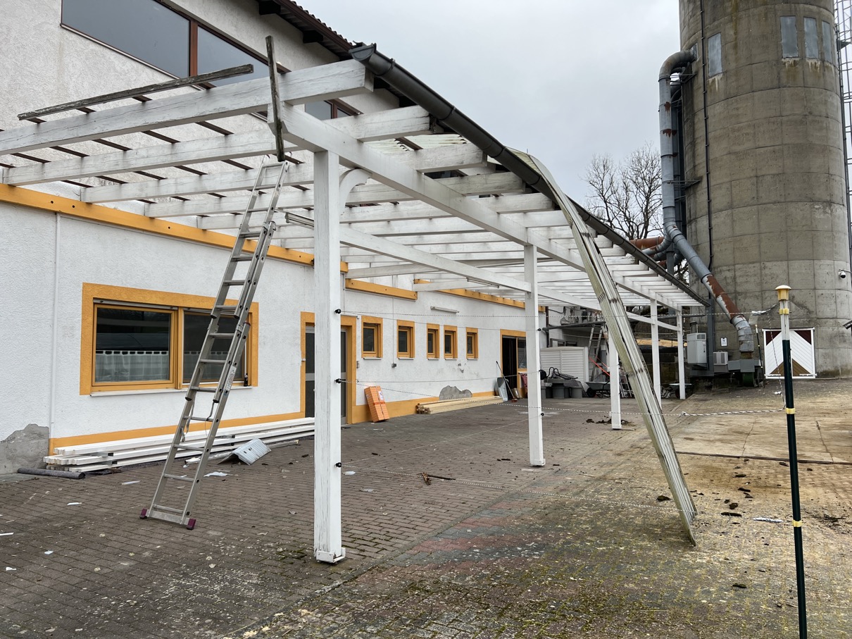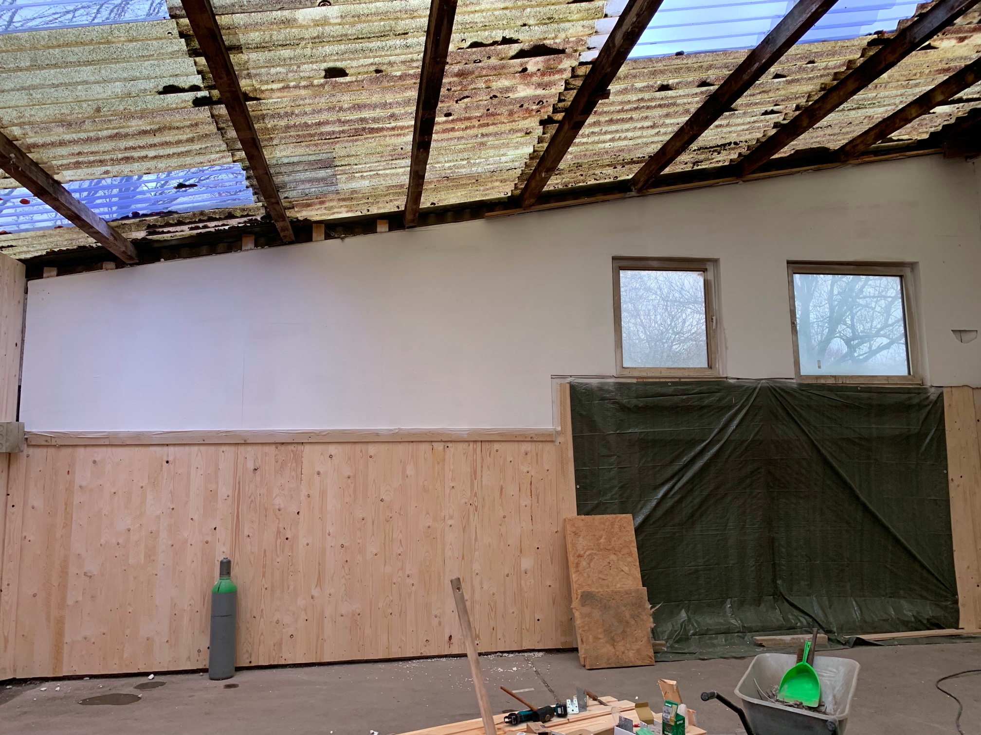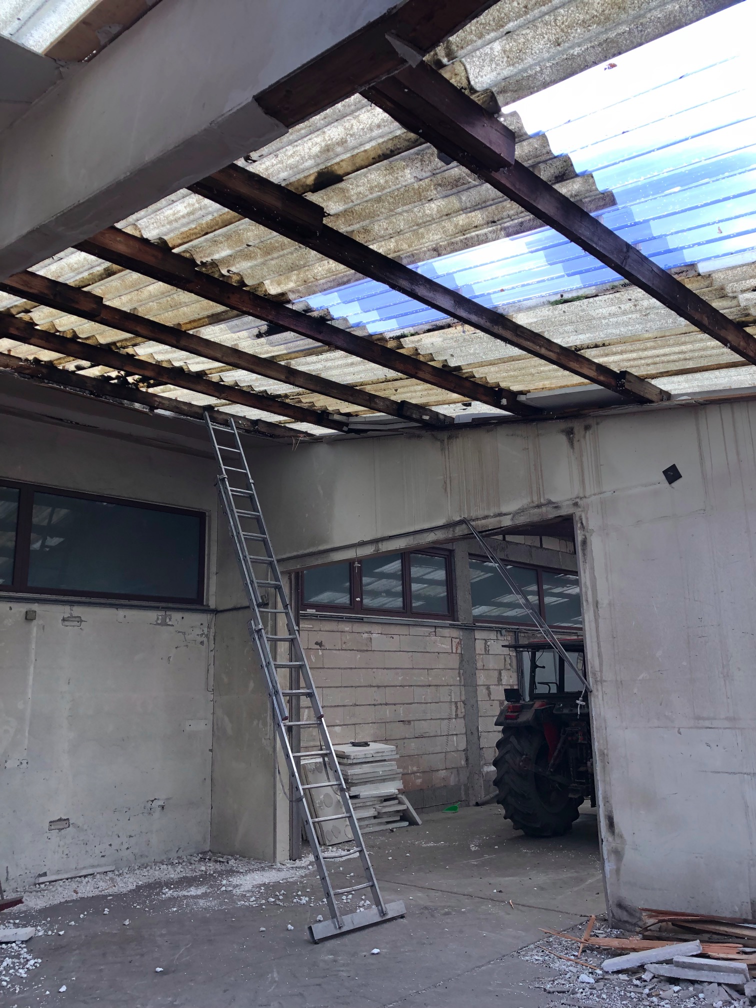 Und wenn man denkt, man sei aus dem Gröbsten raus, dann kommt es knüppeldick: am 10.03.2019 fegte ein heftiger Sturm ("Eberhard") auch über Schlüchtern-Gomfritz und leider auch über unsere Hommelmühle und deckte im zukünftigen Offenstall eine Platte ab, so dass der ganze Regen/Schnee ungehindert in das frisch Renovierte laufen konnte:
