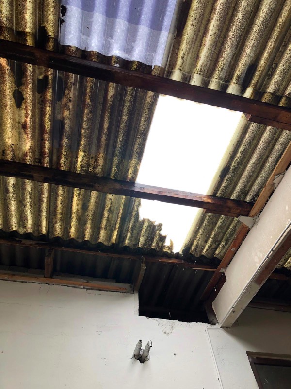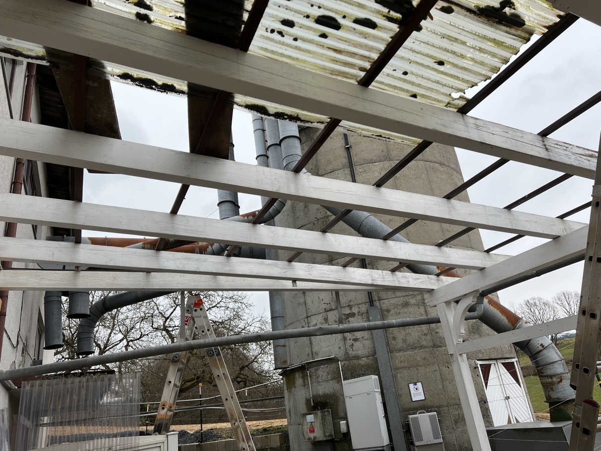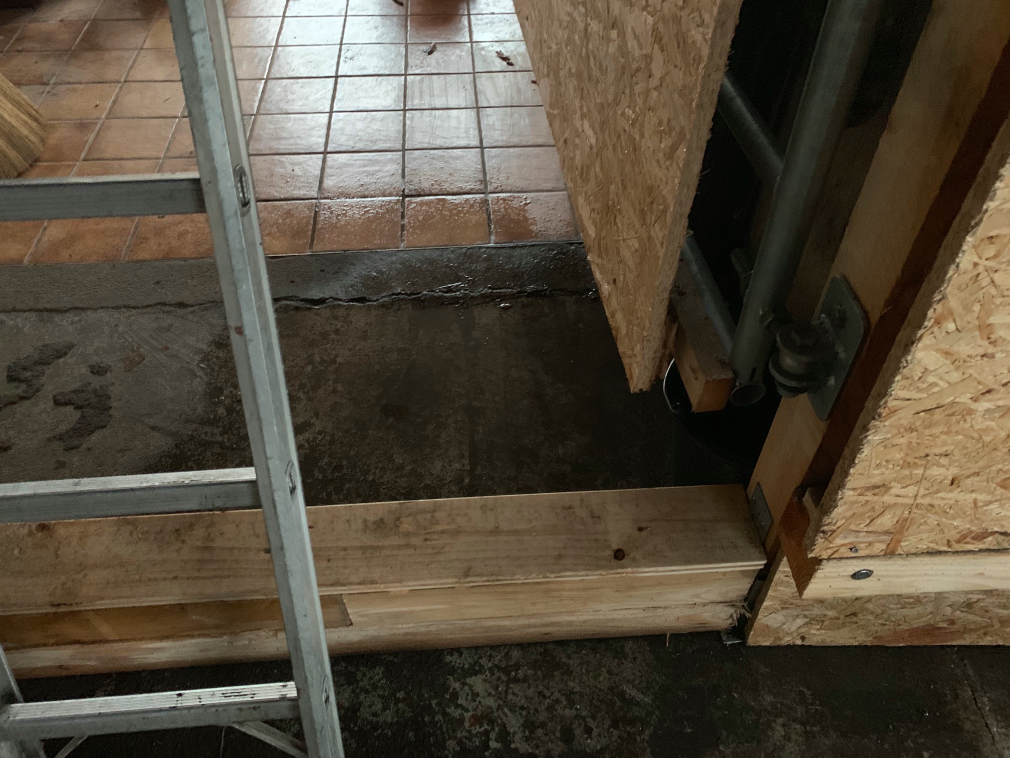 Und wenn man denkt, man sei aus dem Gröbsten raus, dann kommt es knüppeldick: am 10.03.2019 fegte ein heftiger Sturm ("Eberhard") auch über Schlüchtern-Gomfritz und leider auch über unsere Hommelmühle und deckte im zukünftigen Offenstall eine Platte ab, so dass der ganze Regen/Schnee ungehindert in das frisch Renovierte laufen konnte:
