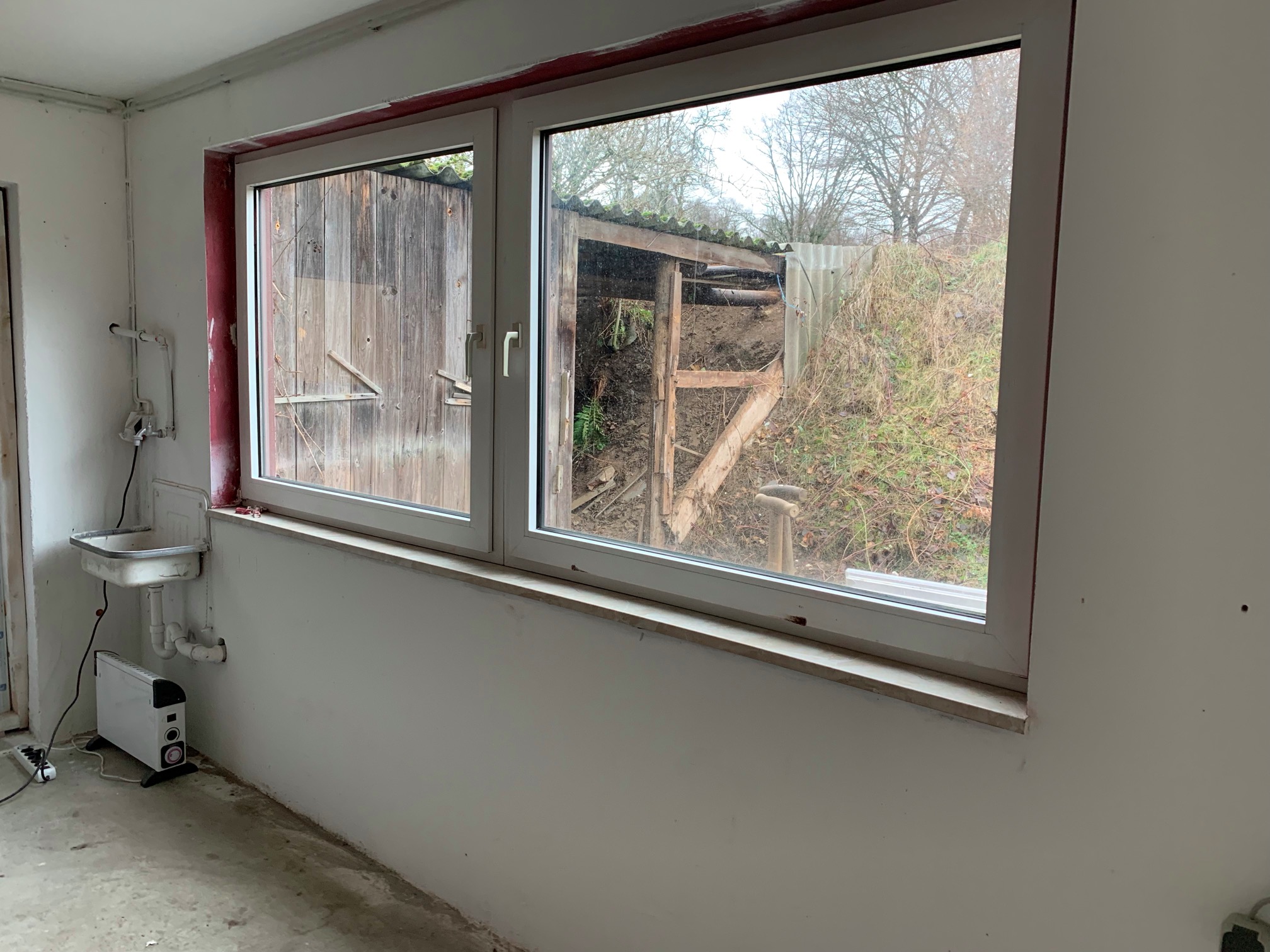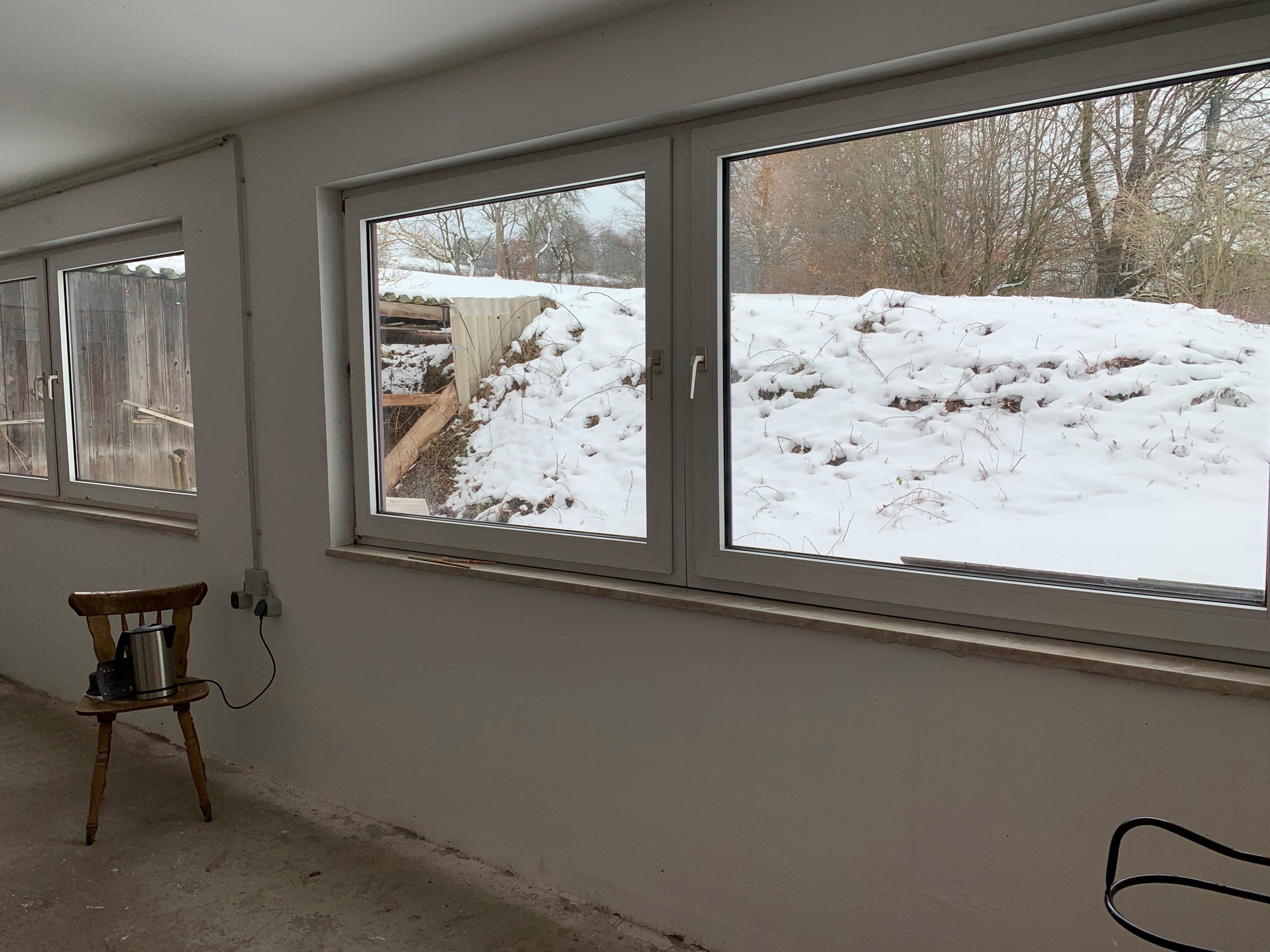 Gut, den Epoxiboden werde ich erst gießen, wenn es wärmer geworden ist. Aber die ebenfalls rot gestrichenen Fenster müssen noch weiß werden - die Farbe muss abgekratzt werden, da weiße Kunststofffenster unter der Farbkruste sind ... das gibt viel Muskelpower.