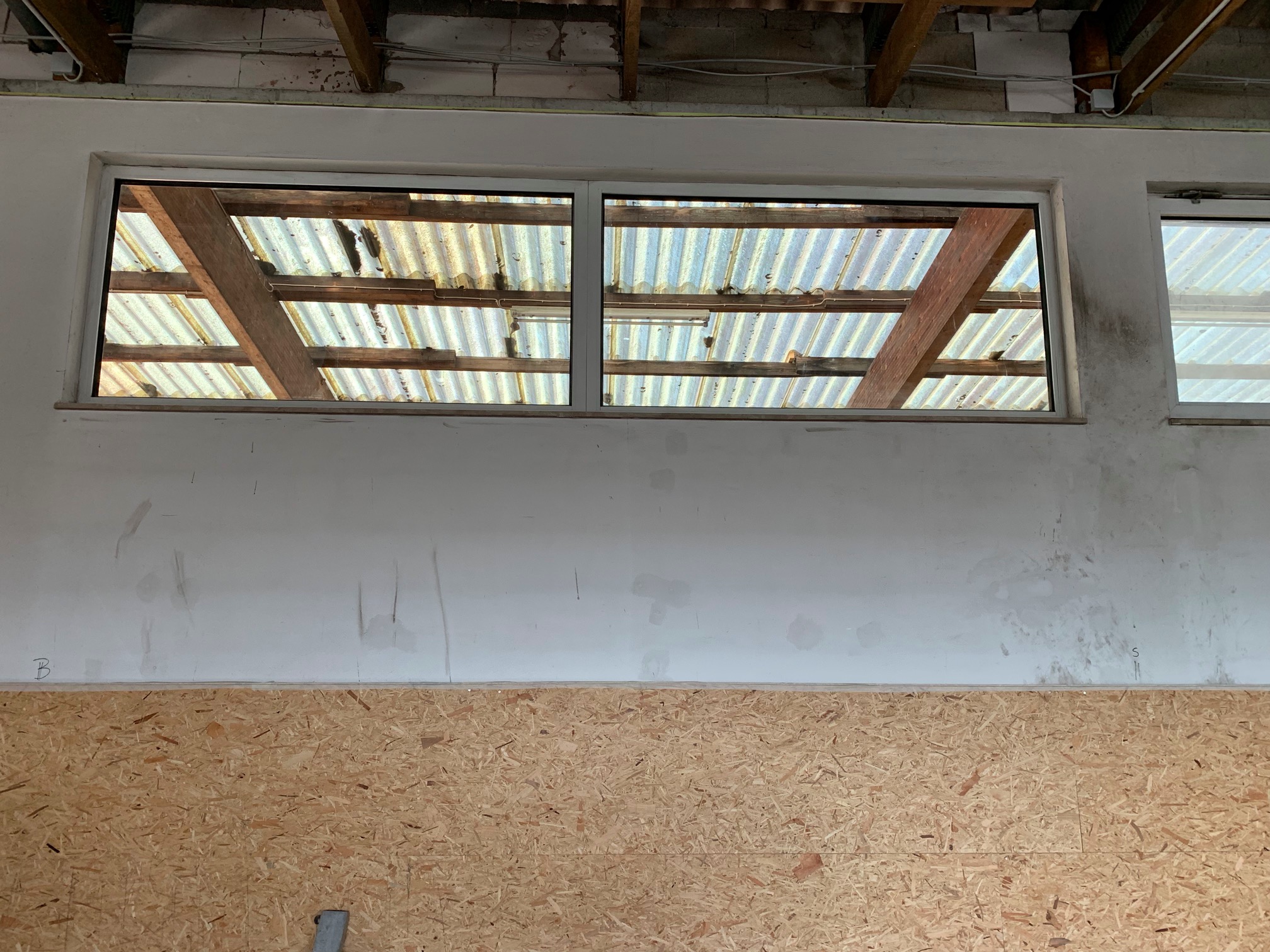 Im künftigen Stalltrakt ist dann noch ein defektes Scheibenelement - wird "pferdesicher" mit einer Plexiglasscheibe verschlossen und in diesem Zusammenhang auch gleichzeitig der Kopf ansehnlich verkleidet: