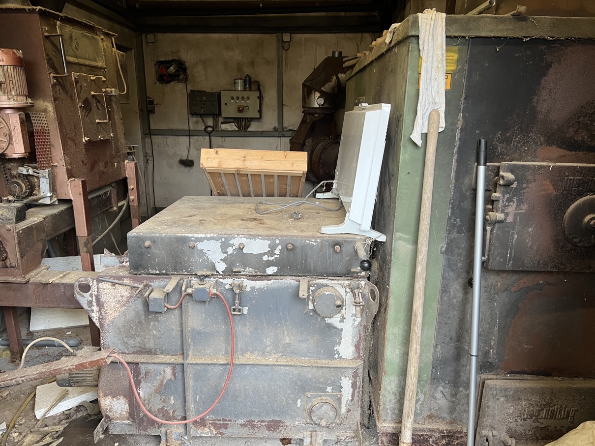 vorne die Spänezuführung, rechts der gigantische Heizkessel |