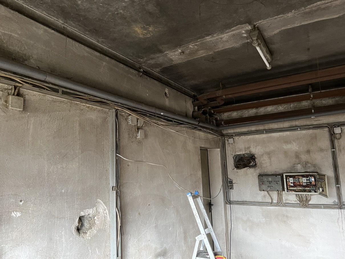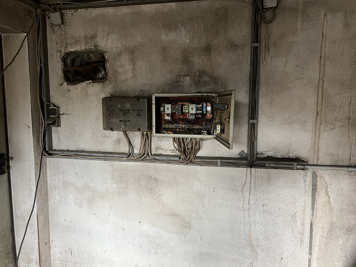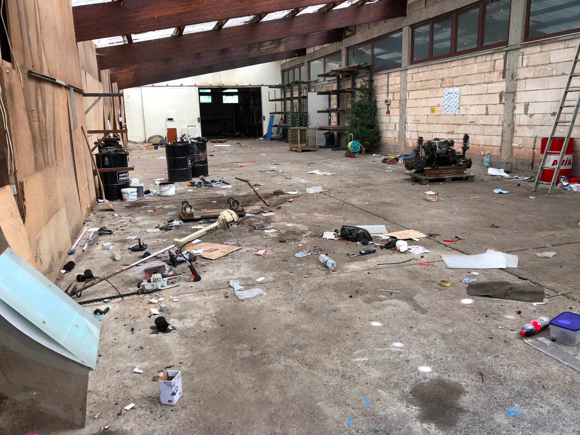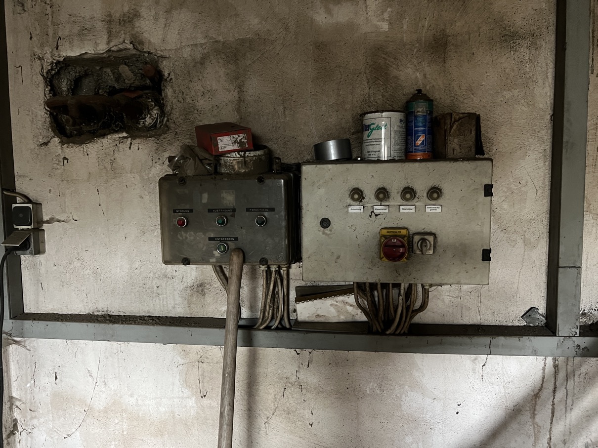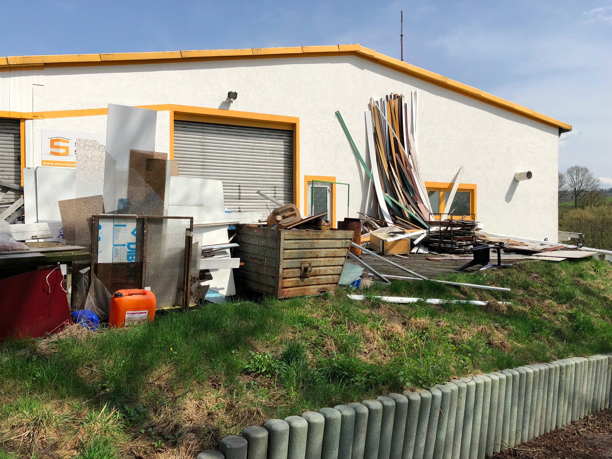 Aussen hatten wir ja schon seit längerem aufgeräumt (und vieles als Sperrmüll und Baumischabfall abfahren lassen), aber innen konnten wir nur wenig machen, da sich die Tore nicht öffnen ließen - das lag an den diversen maroden Unterverteilungen (alle ohne jegliche Kennzeichnungen), so dass erst mal ein Elektriker ran musste.