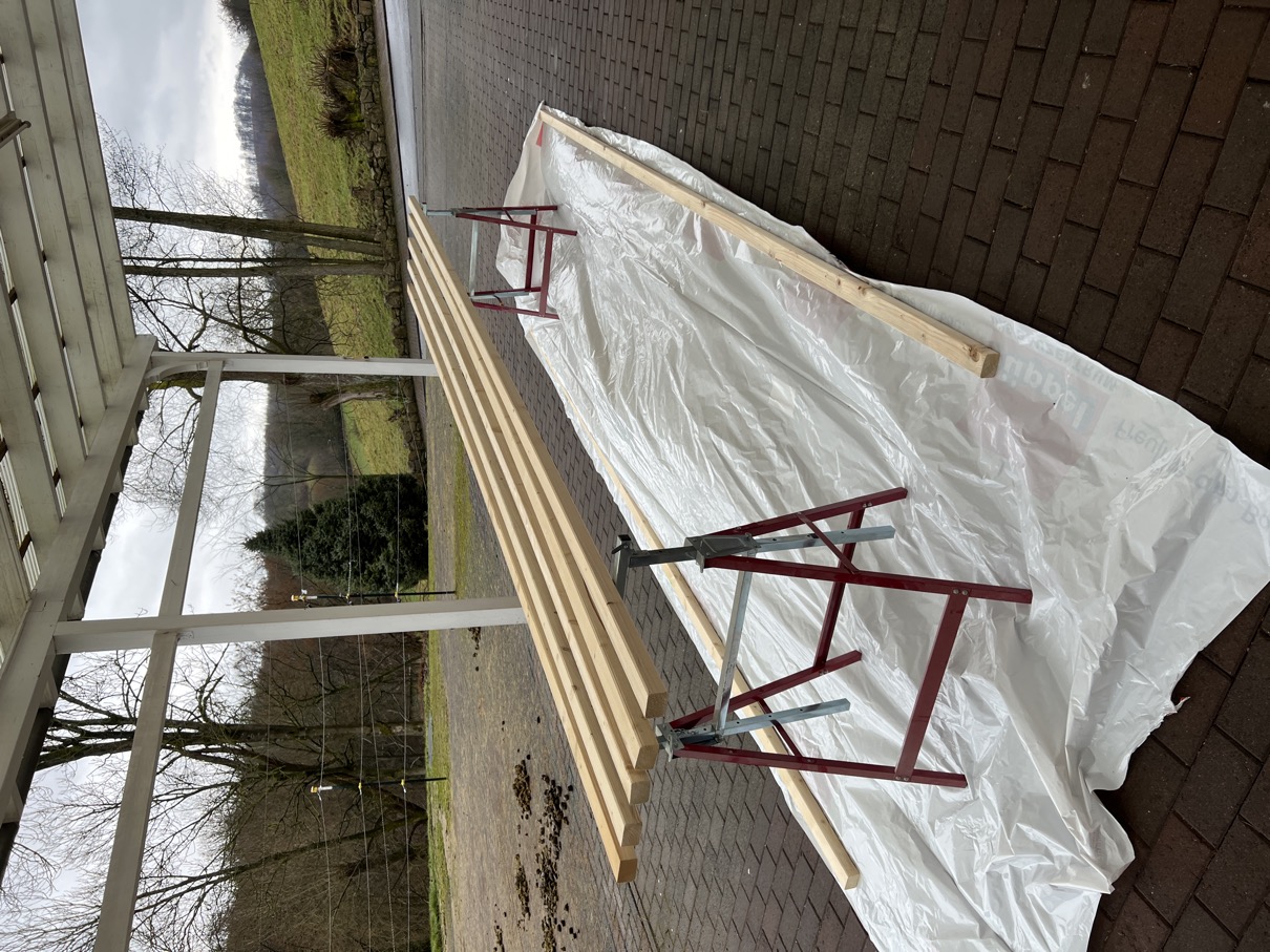 zunächst einmal Vorbereitung: die alte Querlattung wird mit entfernt und durch neue Querlatten (4*6 cm) ersetzt, die weiß gestrichen werden .... |