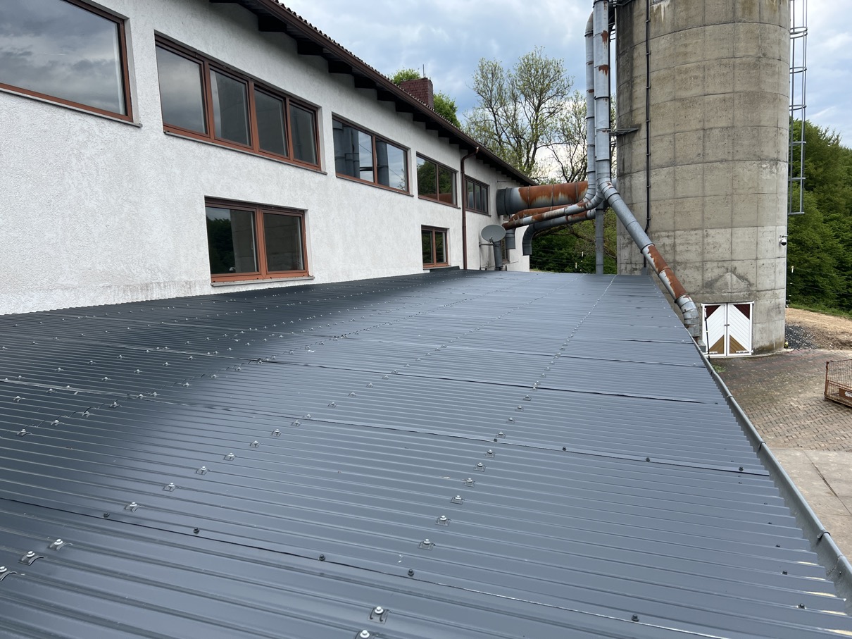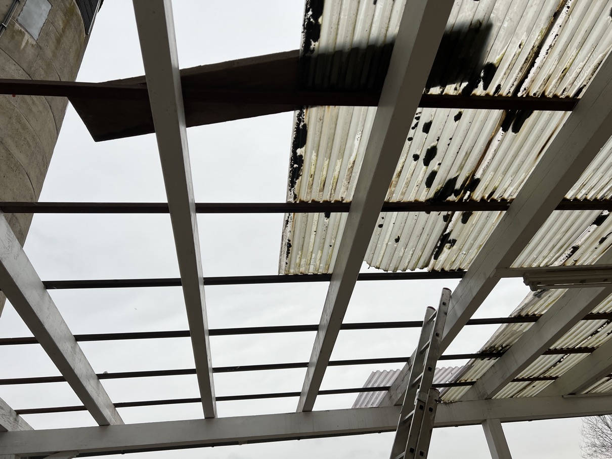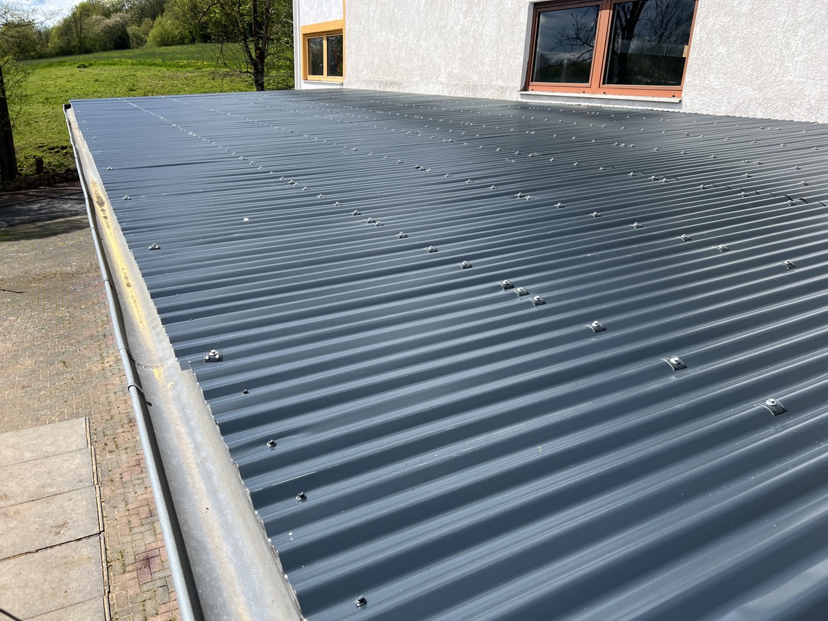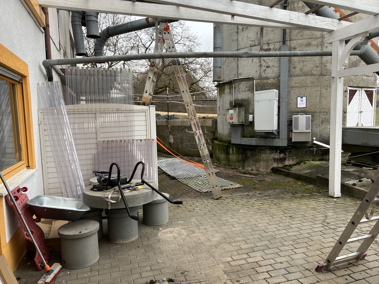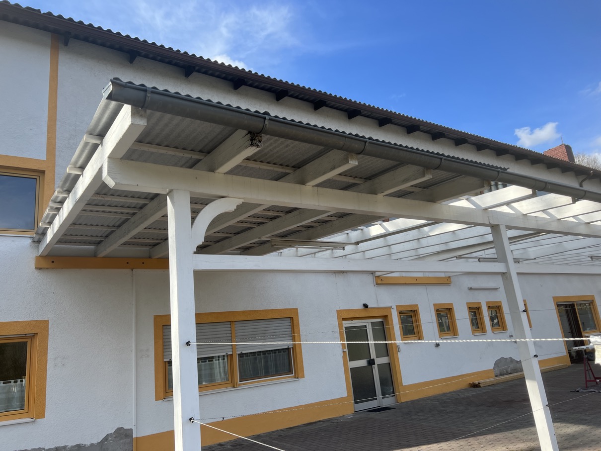 März/April 2023: Und dann war da noch das Vordach des "Bürotraktes", belegt mit PVC-Wellplatten, die jedoch schon so rissig sind, dass sie ausgetauscht werden müssen. Hier habe ich überlegt, das Vordach mit Wellblech zu belegen und darauf dann eine rd. 19 KW/p-Fotovoltaiganlage zu installieren - aber eins nach dem anderen: