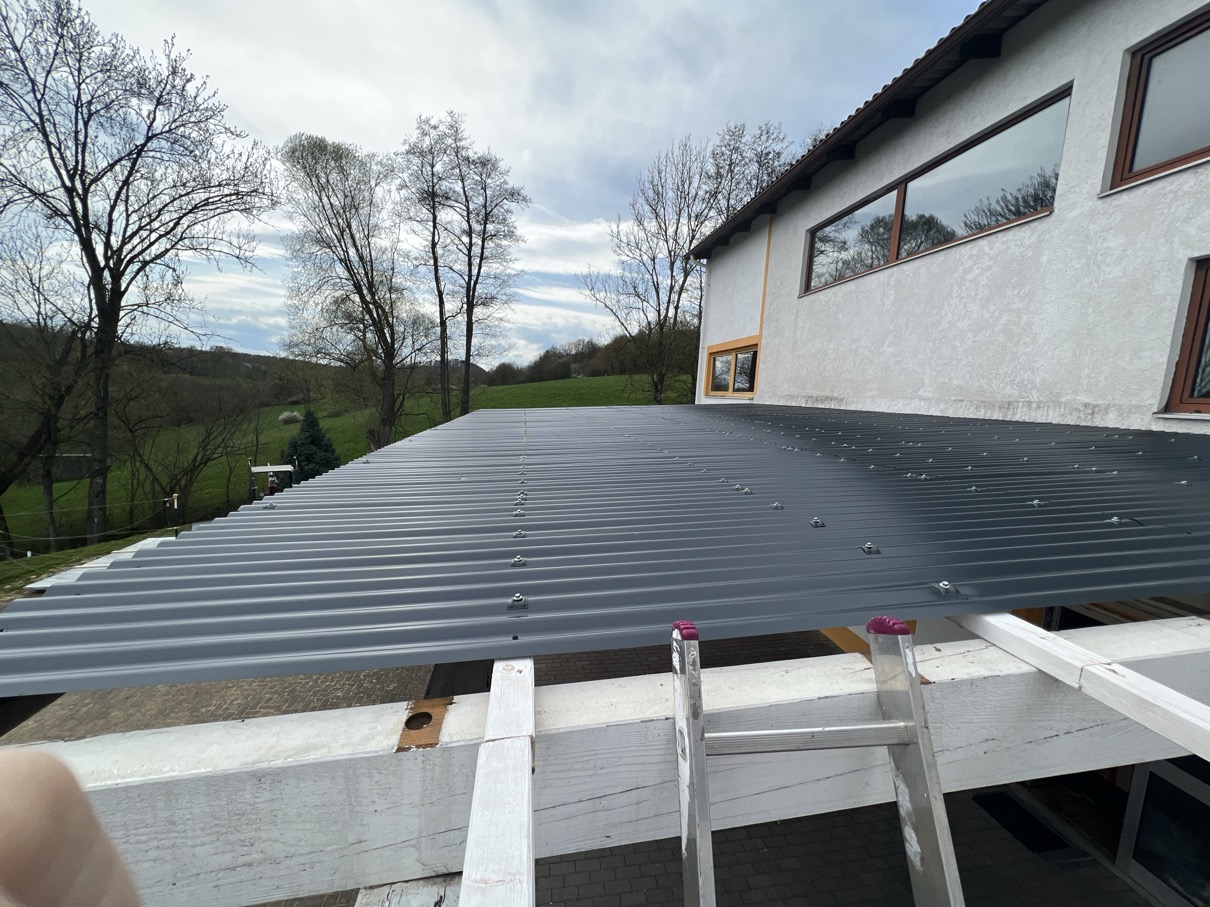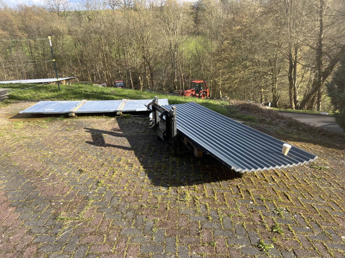 Ich habe mir die Wellblechplatten auf die Palettengabel für meinen Hoflader (Schäffi) gepackt und dann auf die Höhe des Vordaches angehoben, um dann jeweils eine Platte auf die Balkenlage zu ziehen und dann zu verschrauben .... ja, etwas mühsam, aber alleine geht das nicht viel anders 😇