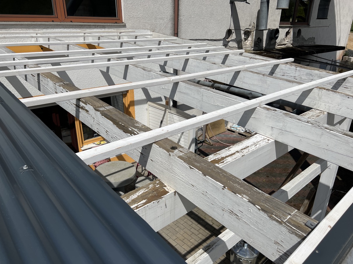 irgendwann ist es geschafft, auch alle Traufbleche und Querlattungen entfernt und die Regenrinne schon mal instand gesetzt; damit Step 2 erledigt |