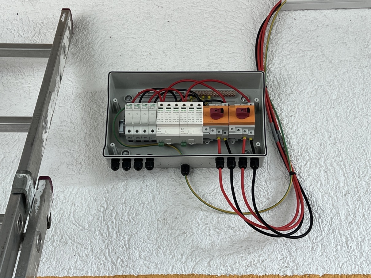 gleich aufgehangen (Sohn hat geholfen - wiegt schon ganz kräftige 40 Kg) ... und schon mal mit den Strings und der Erdleitung verbunden; dann die Zuleitung zur Unterverteilung angeklemmt -- Vorarbeit ist doch alles!! |