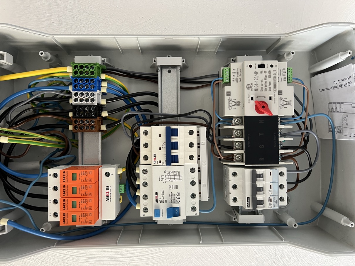 da die Hochvoltbatterie und der Growatt Batteriewechselrichter auch "Notstrom" können habe ich die Unterverteilung nochmals mit einer Notstrom-Umschalteinrichtung (manuell wie elektronisch) versehen, also nochmals alles umgeklemmt (das hatte ich ja weiter oben schon erwähnt) |