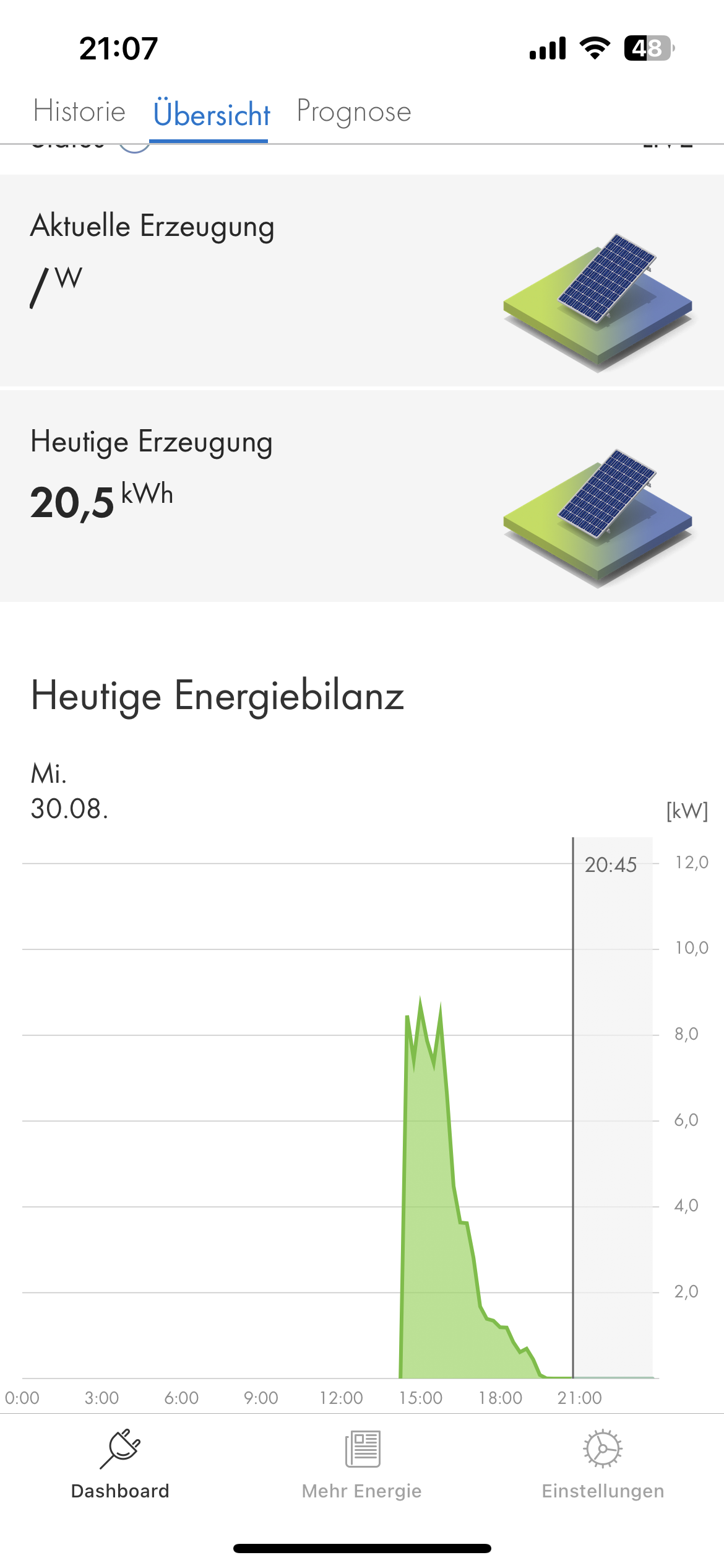 Die Stromproduktion des ersten (halben) Tages: stattliche 20,5 KW in knapp 6 Stunden