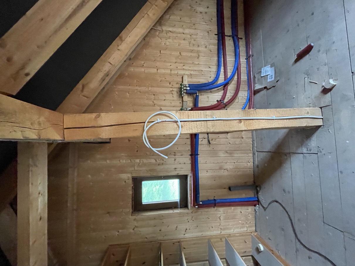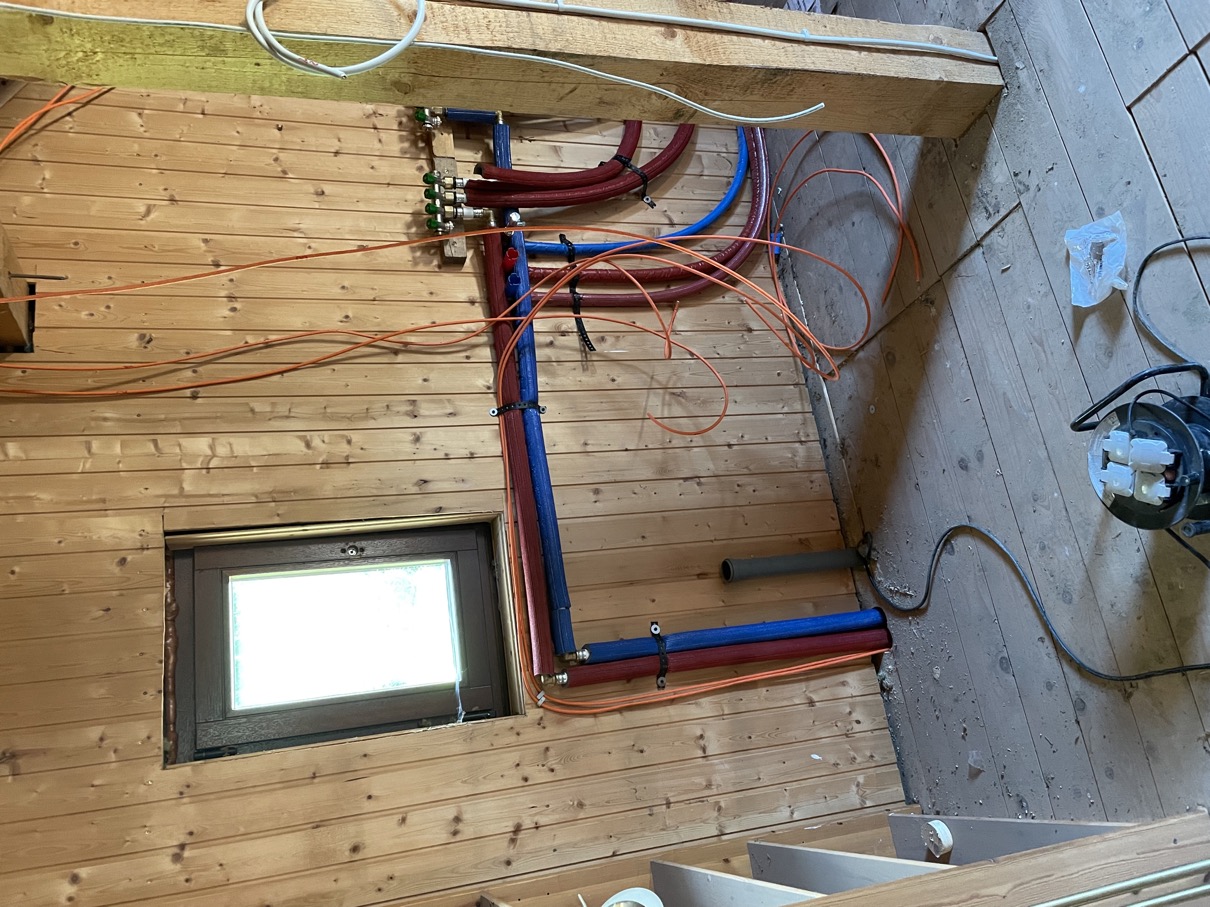 vom DG über das 1. OG nach unten in das EG gezogene 26er-Leitungen als Vor- und Rücklaufleitung, um hier mal einen wasserführenden Ofen zur Unterstützung der Heizung oder des Warwassers anzuschließen. |