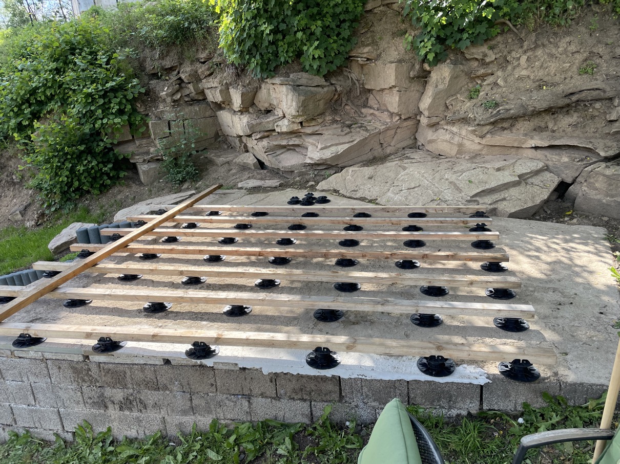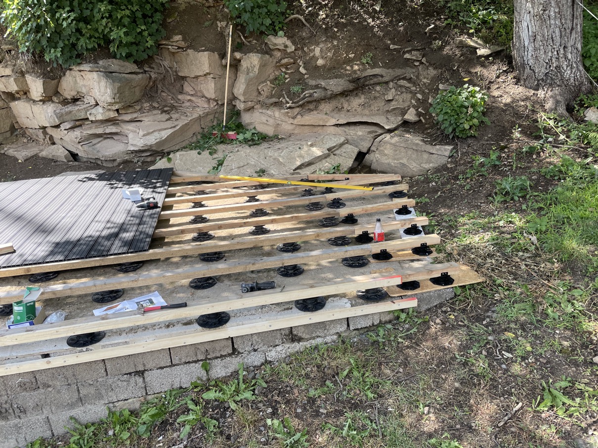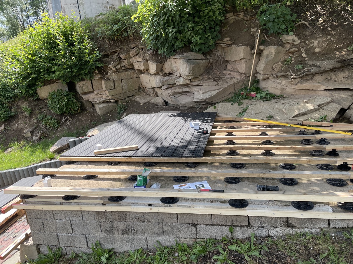 der Freisitz ist nicht winklig, daher muss ich die Ausrichtung anpassen -> dazu fehlen wir aber noch Stelzlager, die ich erst noch bestellen muss. |