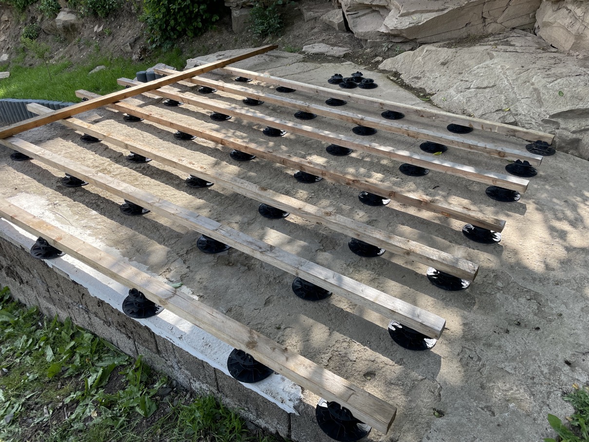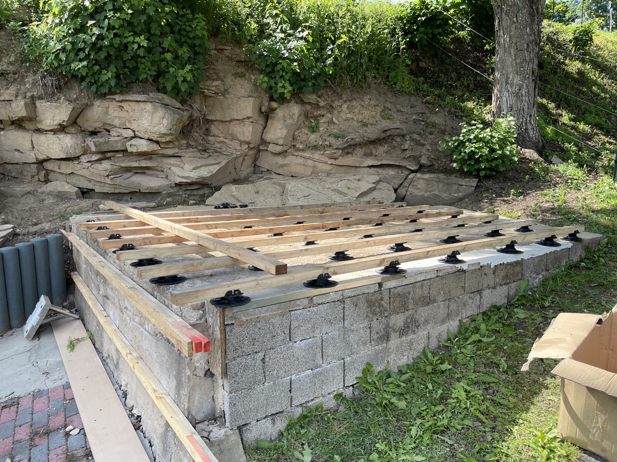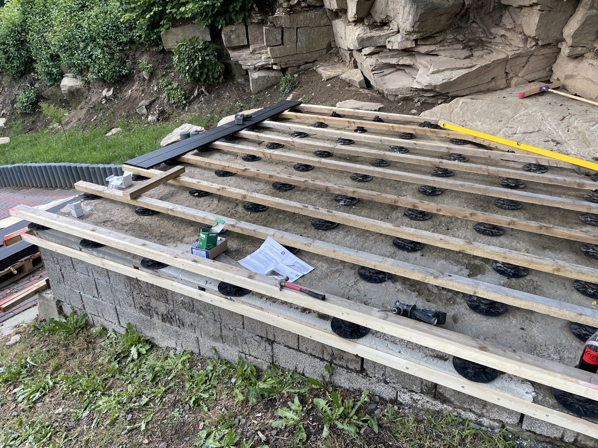 Aufbau Freisitz: 6x6er Kanthölzer auf Stelzlager mit entsprechendem Gefälle |