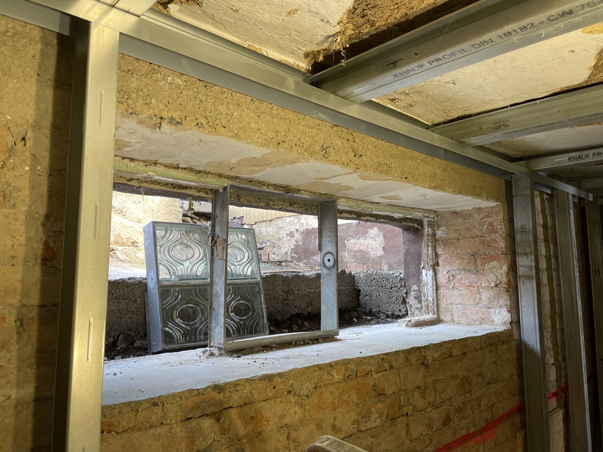 Zunächst einmal die alten Glasbausteine ausgestemmt (natürlich mit Schutzbrille - das Glas splittert ganz schön) und alles sauber gemacht |