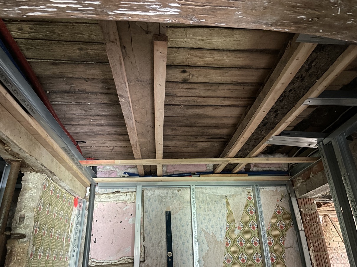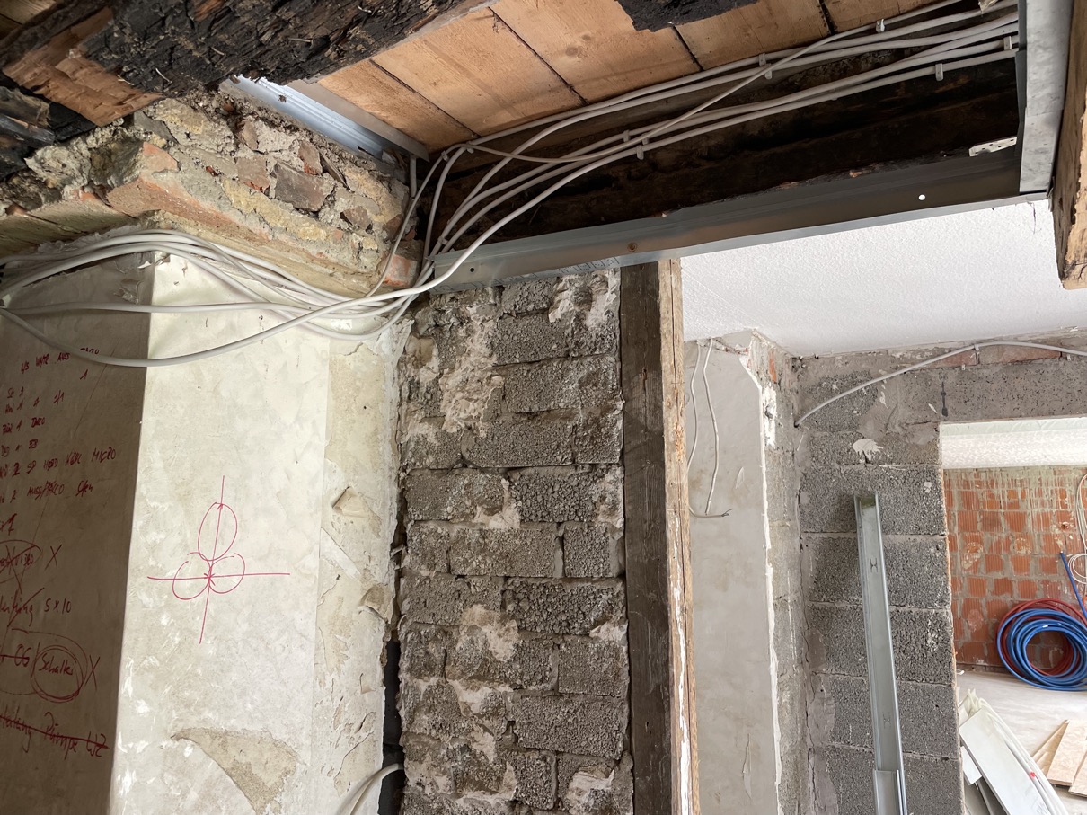 habe mal vorsichtshalber den Tragbalken abgestützt; jetzt haben wir zwar auf der linken Seite mehr Platz für eine größere Badewanne jedoch wird der Platz auf der rechten Seite für die Schalter/Steckdosenkombi schon "sportlich" Immerhin haben wir es damit jedoch auch geschafft eine größere Türe (87,5er) einbauen zu können |