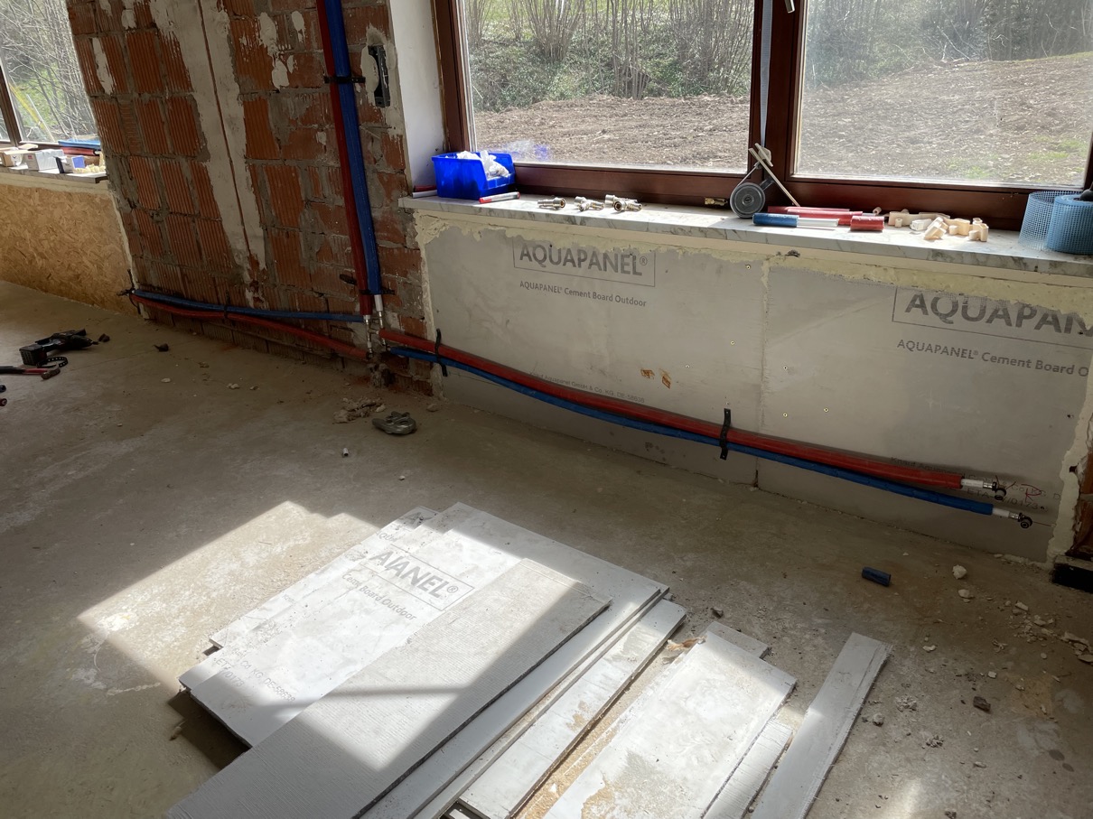 Zuleitungen für das Wohnzimmer (incl. separate Zuleitung für eine Pumpe eines möglichen wasserführenden Heizkamins); Rohre müssen noch verlegt werden .... |