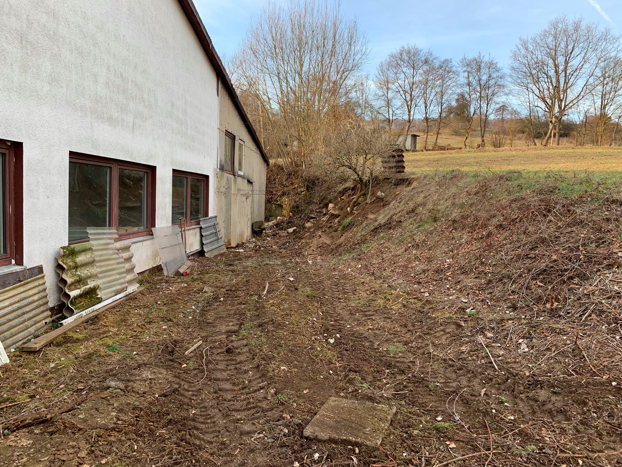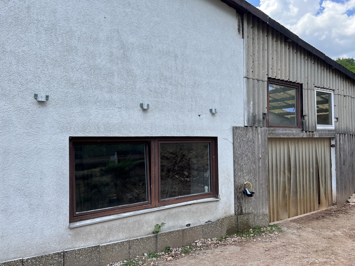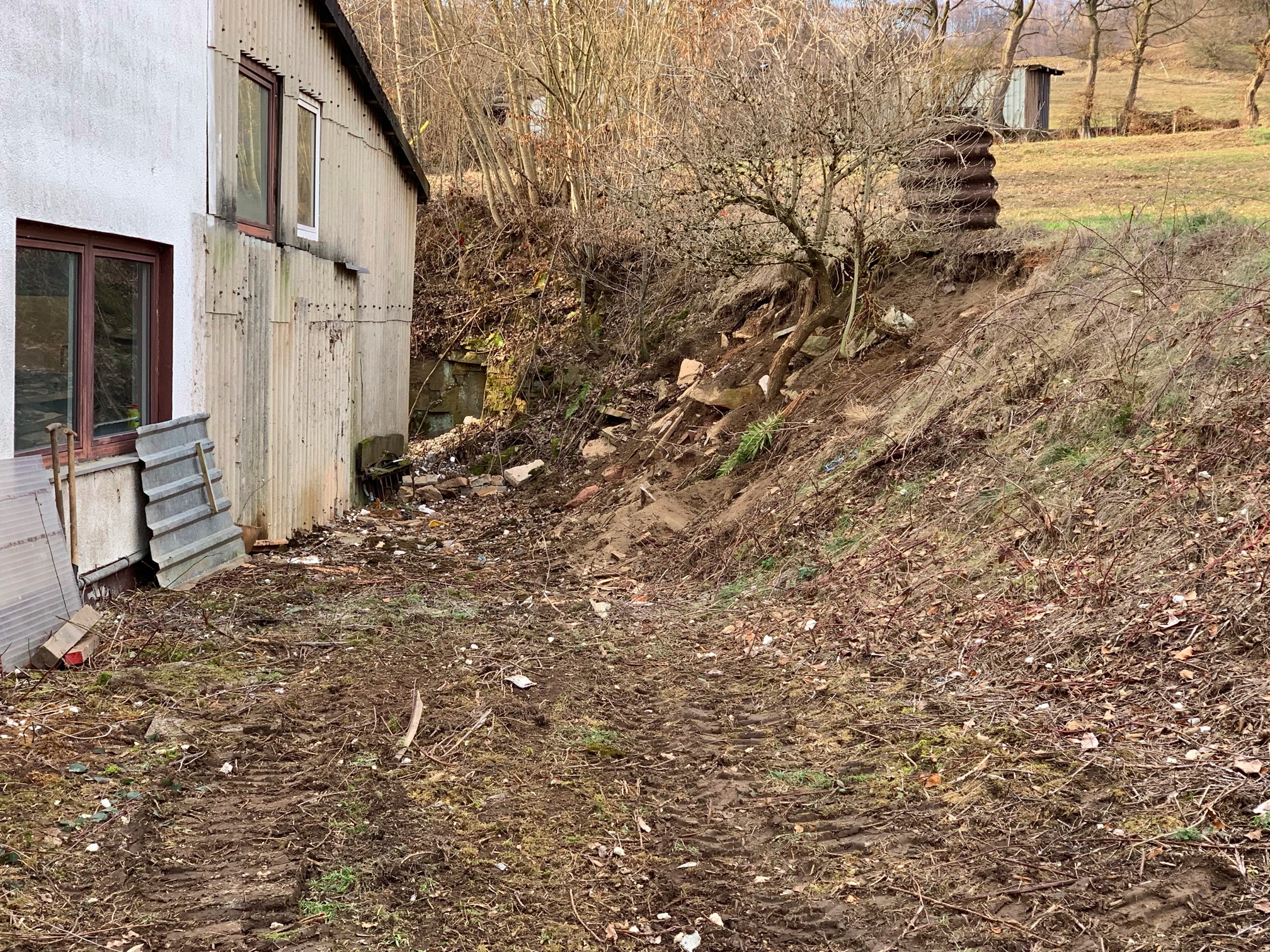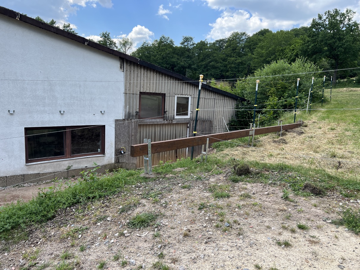 Einen Paddock für unsere Vier (Stand August 2023: 5 Quarter und 1 Appaloosa) wollen wir direkt am Offenstall (also ausgangs des angeschleppten Gebäudeteiles) andocken - eine Fläche, die heute noch mit einem Behelfsbau versehen ist, angrenzend an einen kleinen Hang, der dazu teilweise abgetragen werden muss.