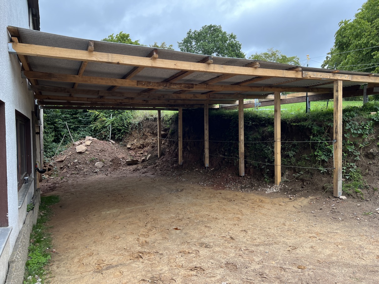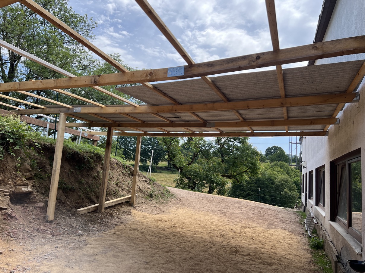 dann das Holztragwerk incl. Unterstützen montiert und die gleichen Bleche wie zur Erneuerung des Vordaches meines Bürotraktes (hatte noch ein paar Bleche übrig - den Rest noch dazugekauft) |