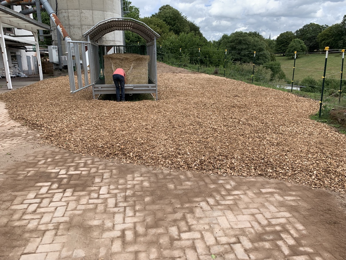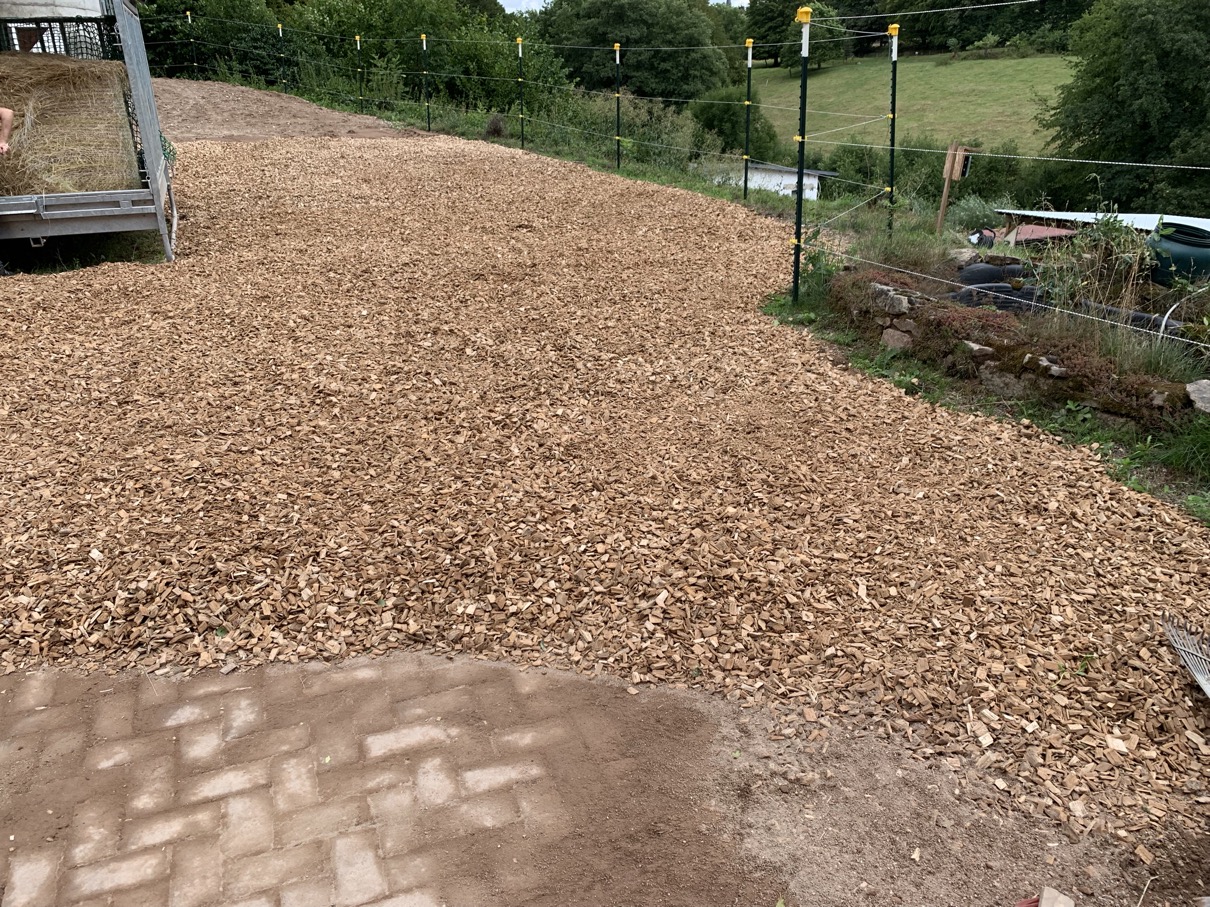 Bei unserem Futterplatz auf dem Paddock hatten wir hinsichtlich des Belages so einiges ausprobiert. Zunächst stand die große Heuraufe ausschließlich auf den Betonsteinen, danach hatten wir noch übrigen Sand um die Raufe aufgeschüttet, was jedoch zu erheblicher Staubbildung im Sommer 2019 geführt hatte und zudem zu einer enormen Abnutzung der Hufe durch den Schmirgeleffekt des Sandes. Entsprechend den gesamten Sand wieder entfernt und tonnenweise Hackschnitzel aufgebracht: