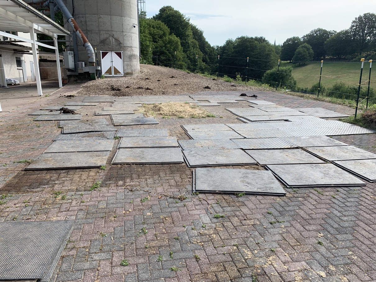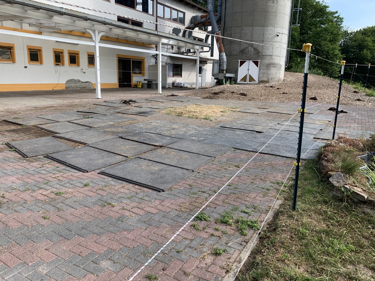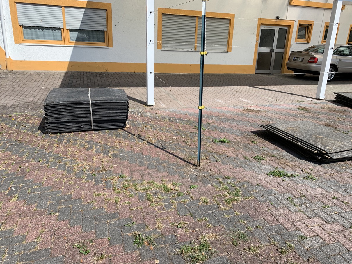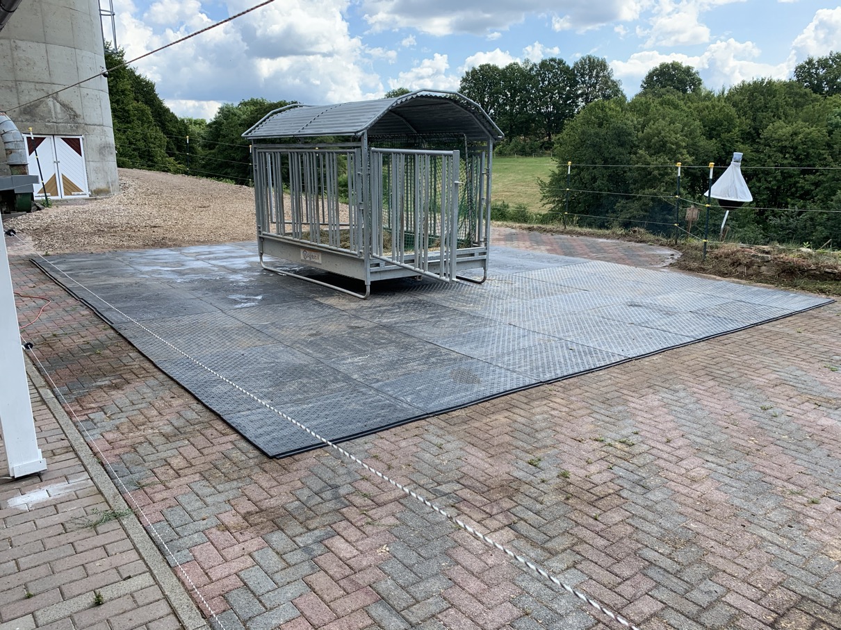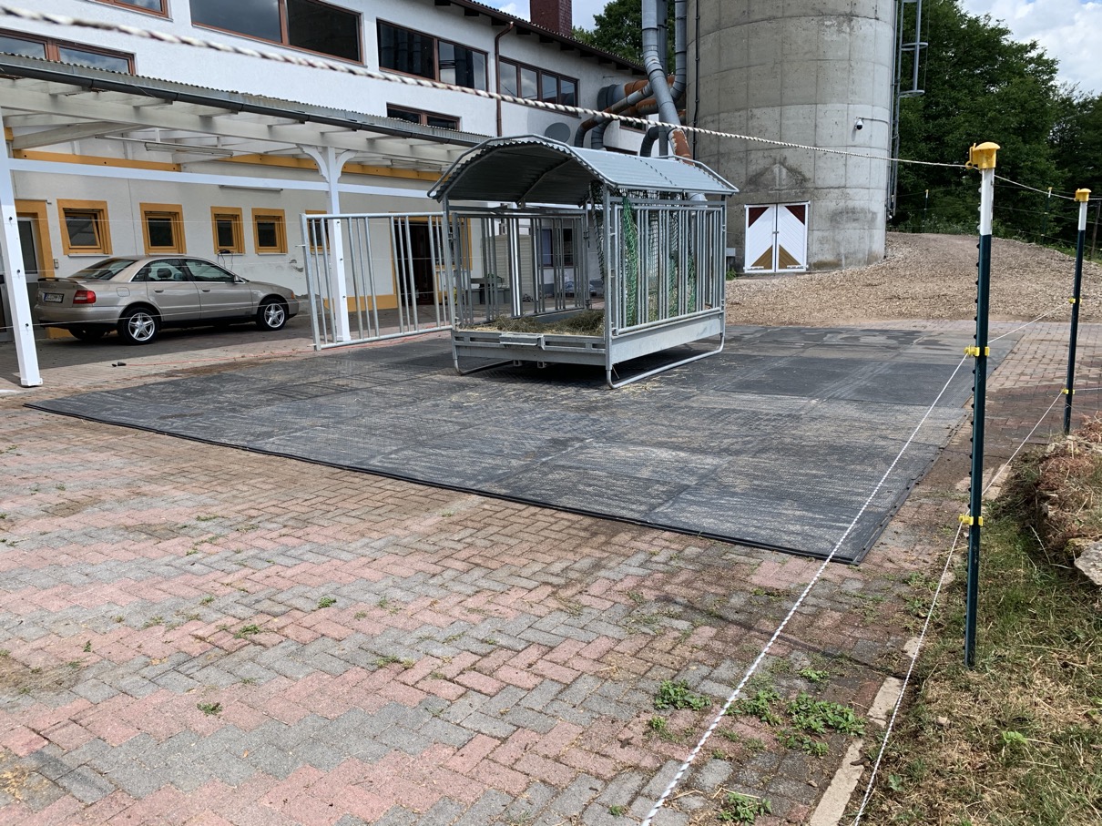 Da die Abnutzung der Hufe trotzdem extrem stark war, unmerklich weniger als auf dem Sandplatz, und wegen der top Erfahrung im Offenstall mit den Stallmatten entschieden wir uns im November 2019, den Futterplatz ebenfalls mit Paddock-/Stallmatten auszustatten (wenngleich das nicht gerade preiswert ist).