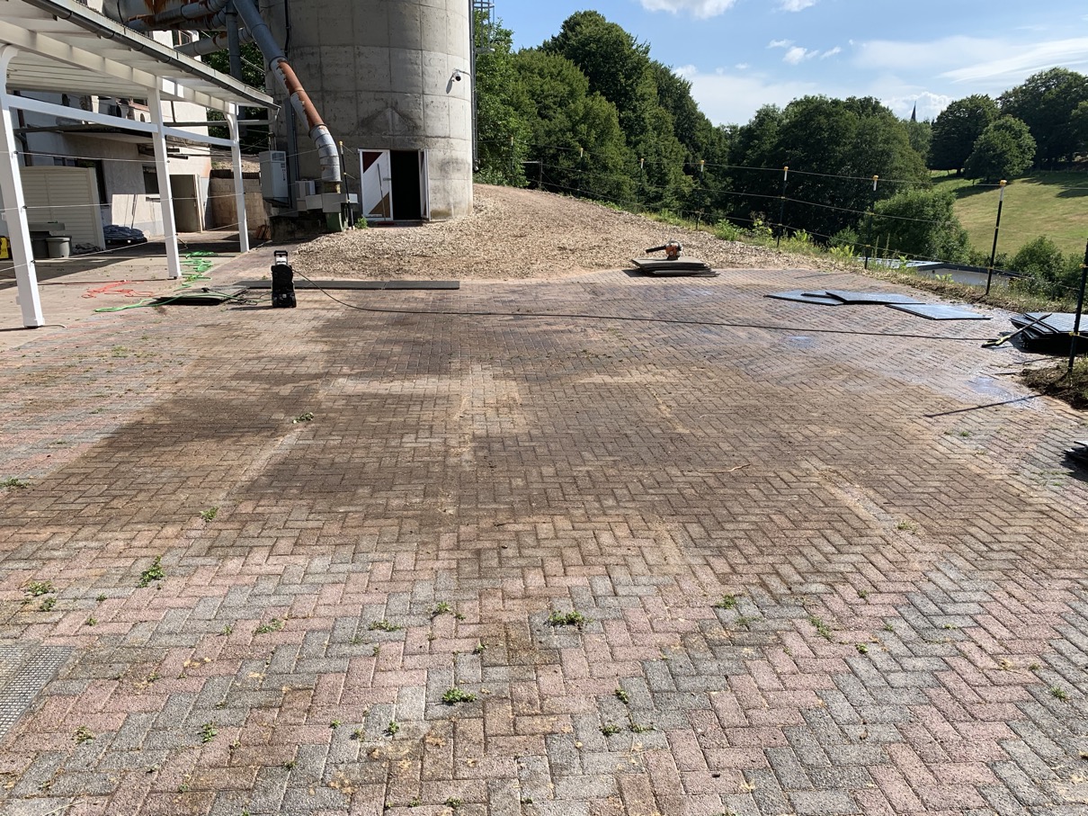 Das war der Stand im August 2019. Aber auch damit wurden wir nicht "glücklich" - das Abäppeln gestaltete sich schwieriger, zu viel Hackschnitzel im Äppelboy und auch ein großer Starkregen tat sein Übriges ---> auch diese Hackschnitzel haben wir dann wieder auf die eigentliche Sandfläche oberhalb und neben das alte Silo geschoben und verteilt .... im September 2019 sah es dann wieder so aus: