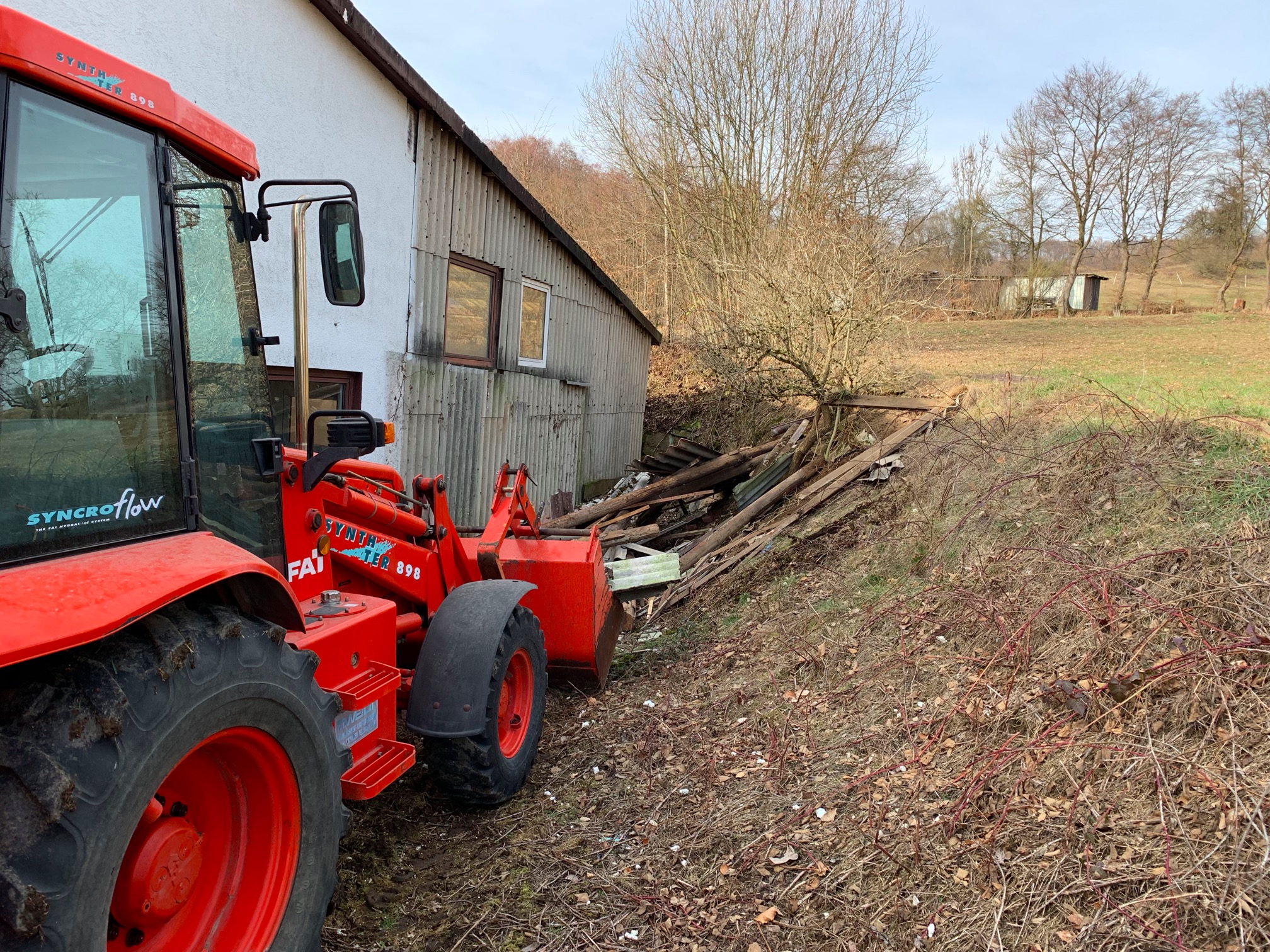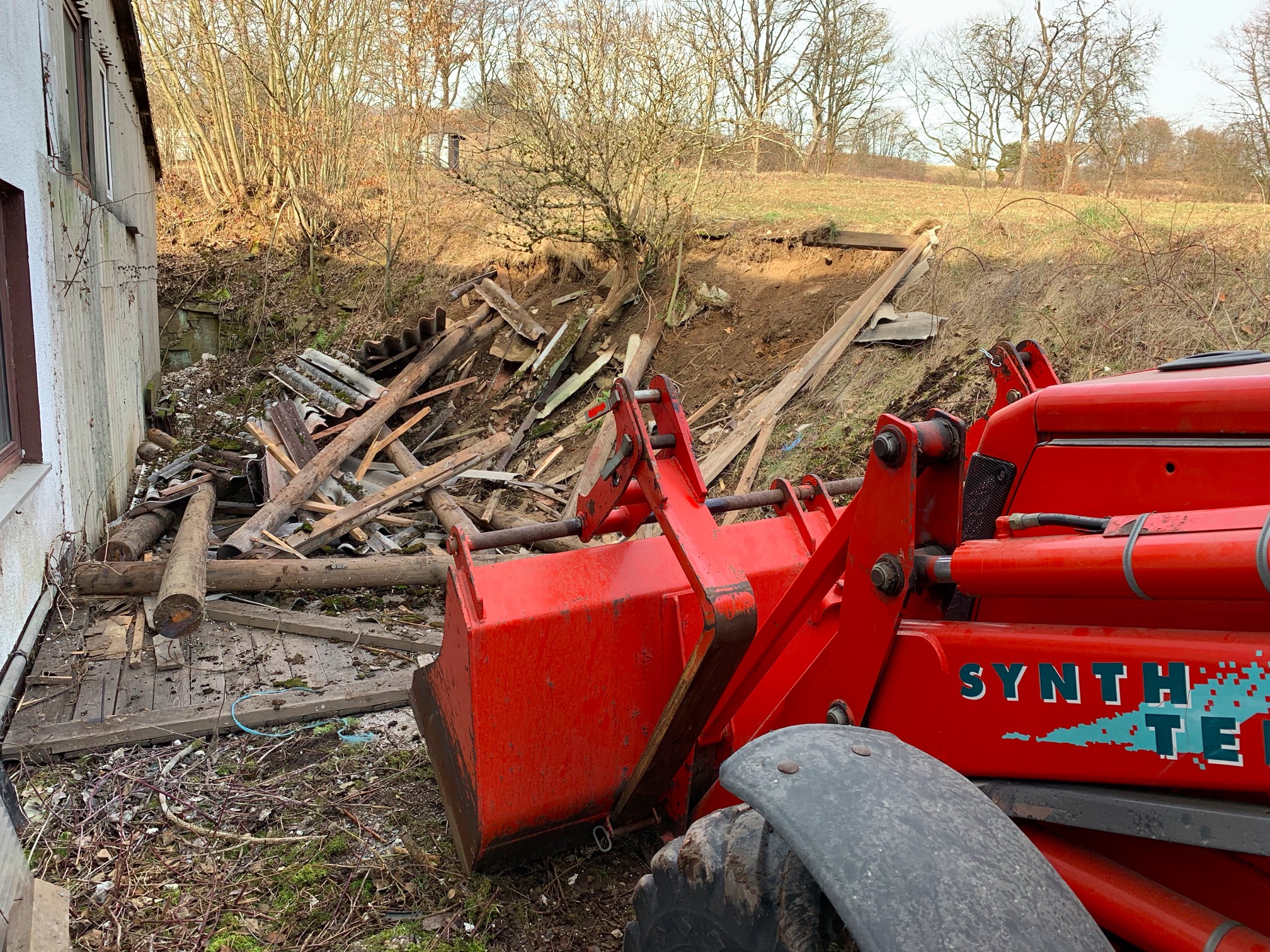 Der Wettergott war gnädig - am Sonntag, den 24.02.2019 schien die Sonne (wie wohl schon die gesamte Woche) und damit war der Boden fest genug, um mit dem Baggerlader hineinzufahren, damit der Abriss der Hütte erledigt werden konnte - jaaaa, Erfolg!