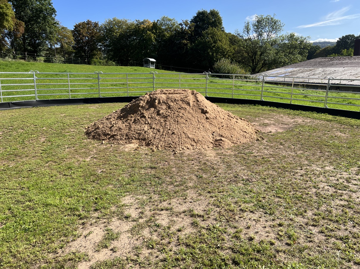 Mit Hilfe unseres Hofladers (Palettengabel und daran die Panels gehängt) ist der Roundpen schnell gestellt; Tine hat kräftig mitgeholfen und dann im Ort Sand bestellt (1 LKW Decksand als Unterschicht und 1 LKW geschwaschener Sand als Tretschicht).