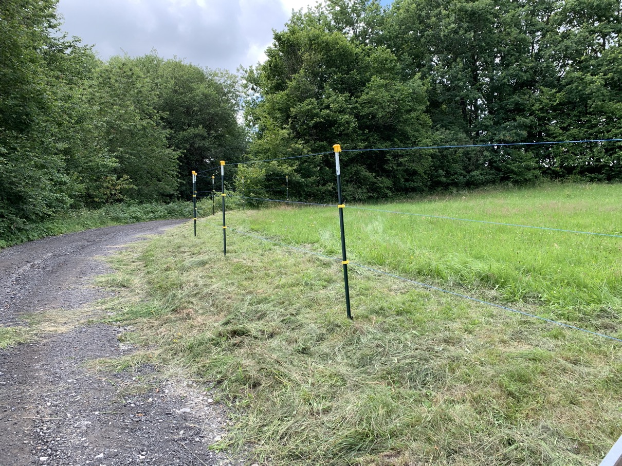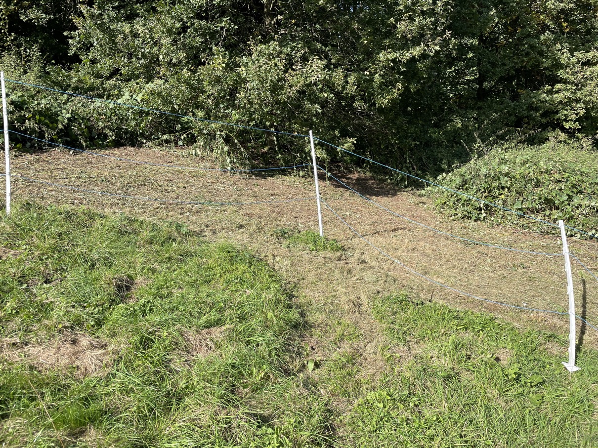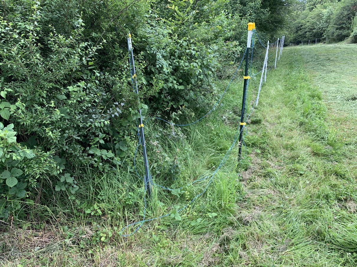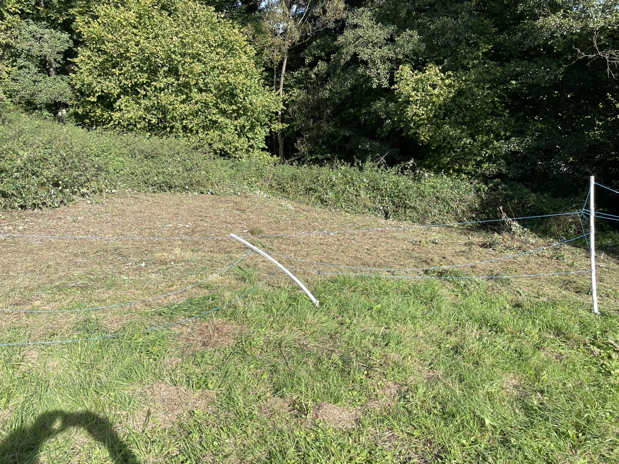 Alles rundherum freigeschnitten (haben Marc-André mit Christine bewerkstelligt), Pfähle gesetzt (haben auch die beiden 😁 gemacht), so dass ich nur noch (mit Tinchen zusammen) die Litze ziehen musste (dreireihig - ca. 1.500 m Litze).