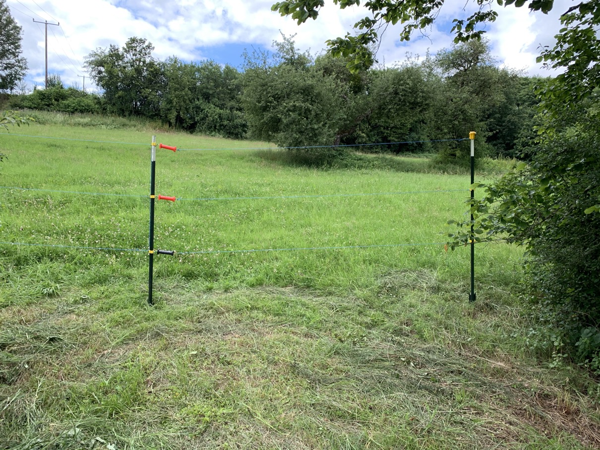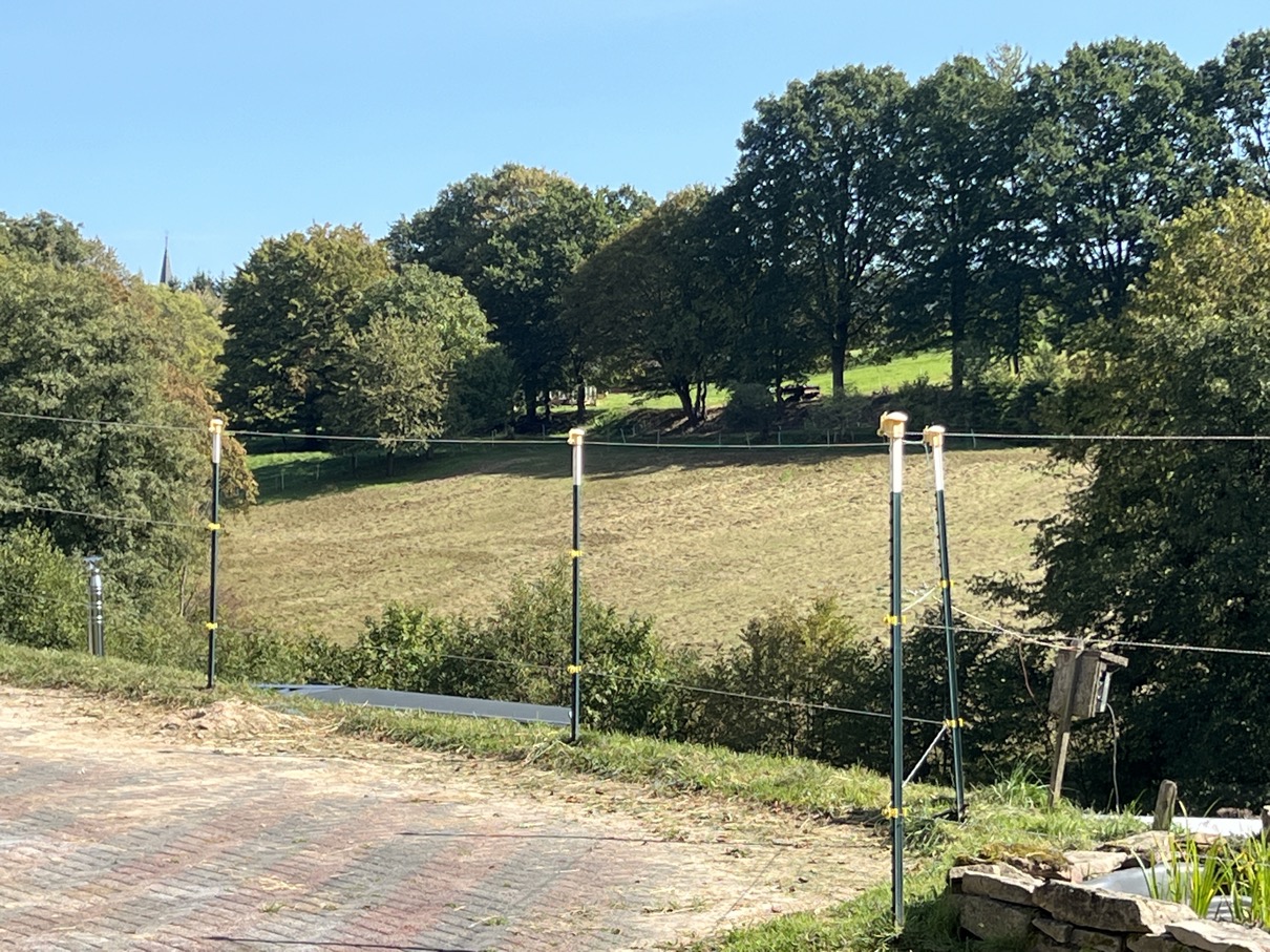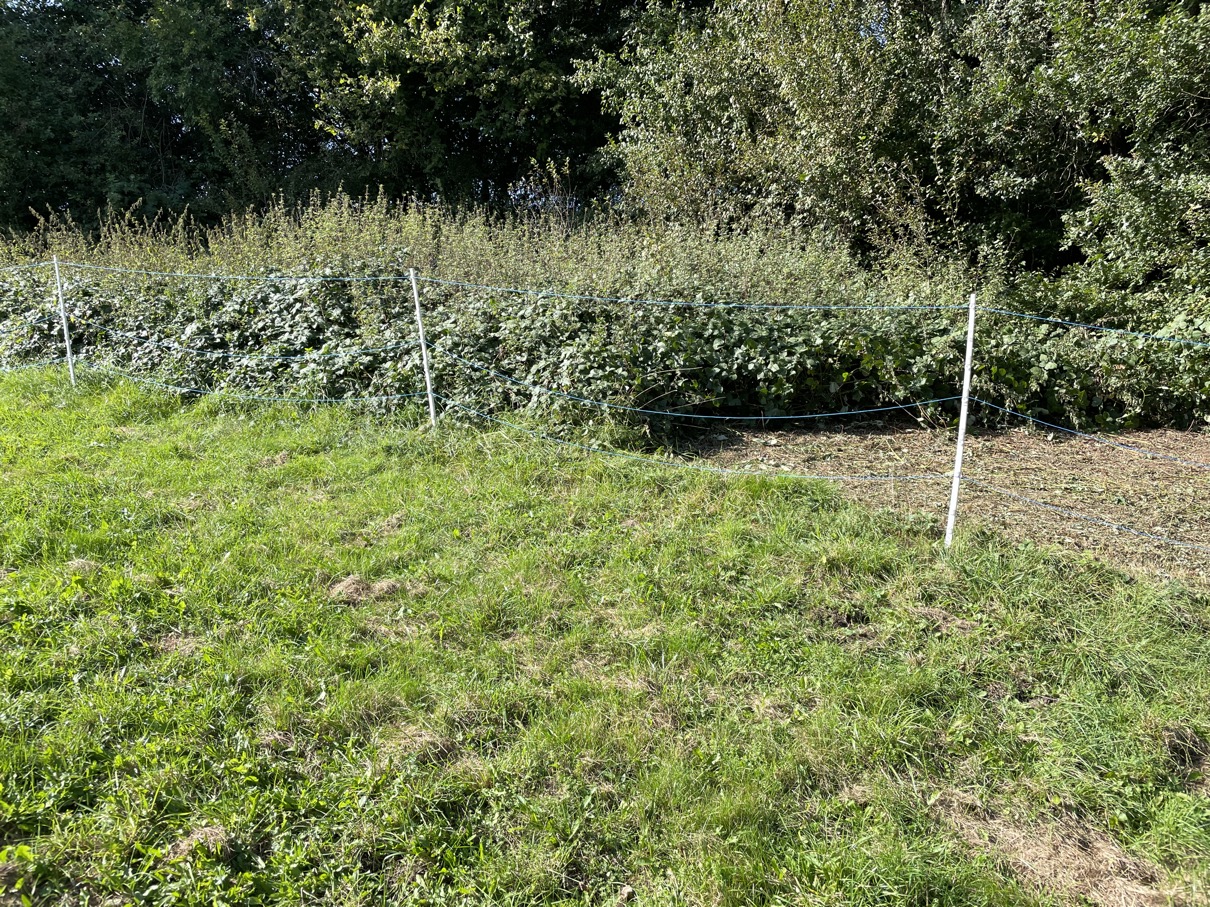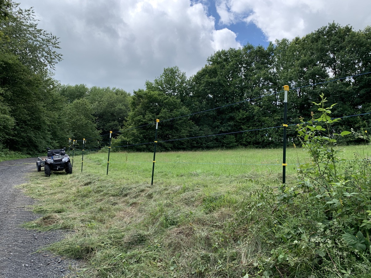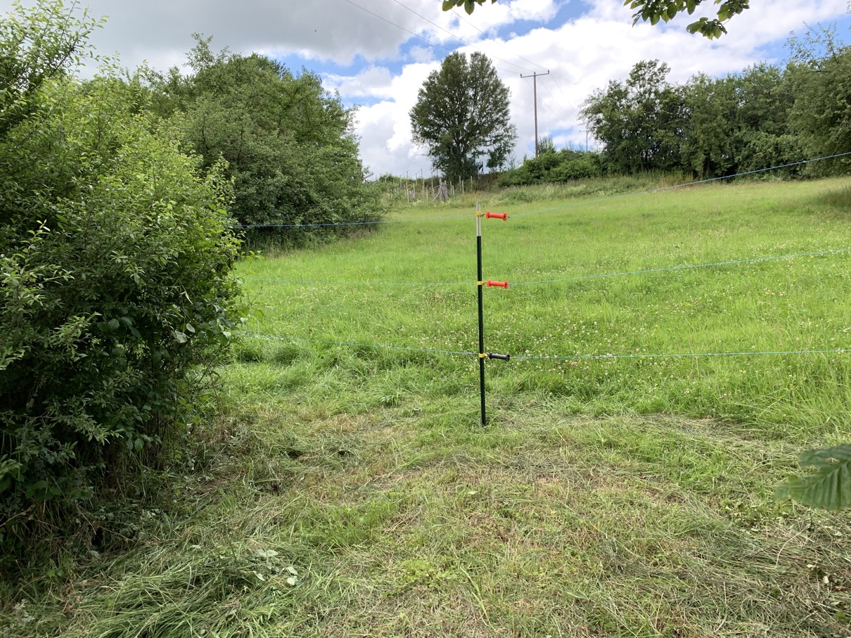 Alles rundherum freigeschnitten (haben Marc-André mit Christine bewerkstelligt), Pfähle gesetzt (haben auch die beiden 😁 gemacht), so dass ich nur noch (mit Tinchen zusammen) die Litze ziehen musste (dreireihig - ca. 1.500 m Litze).