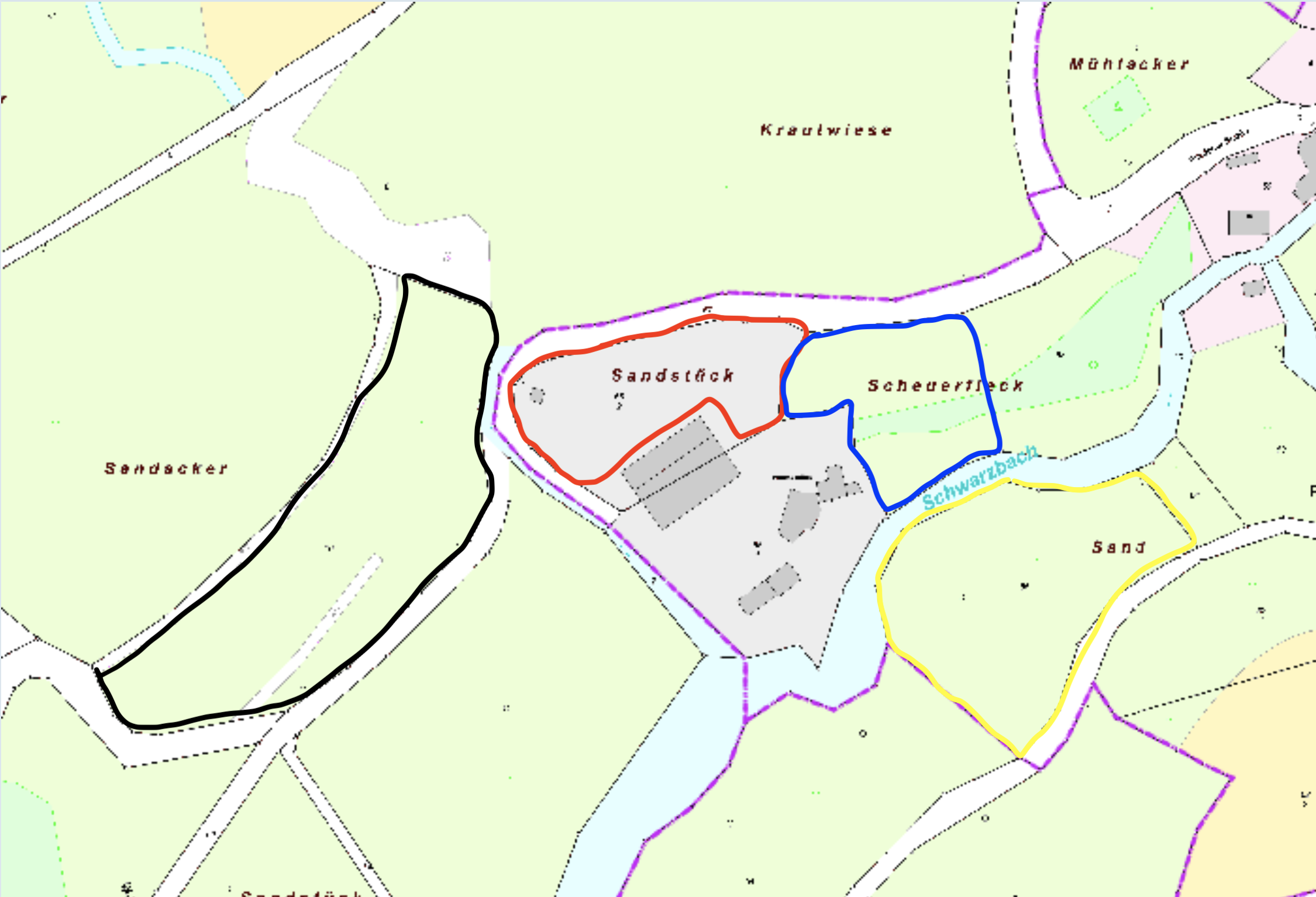 | gelb umrandete Fläche (neu ab 01.06.2020) | Pachtwiese mit rd. 0,9 ha |