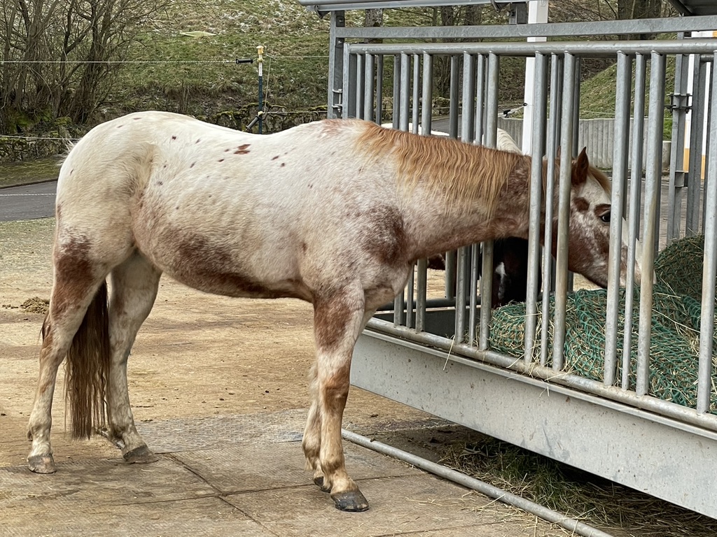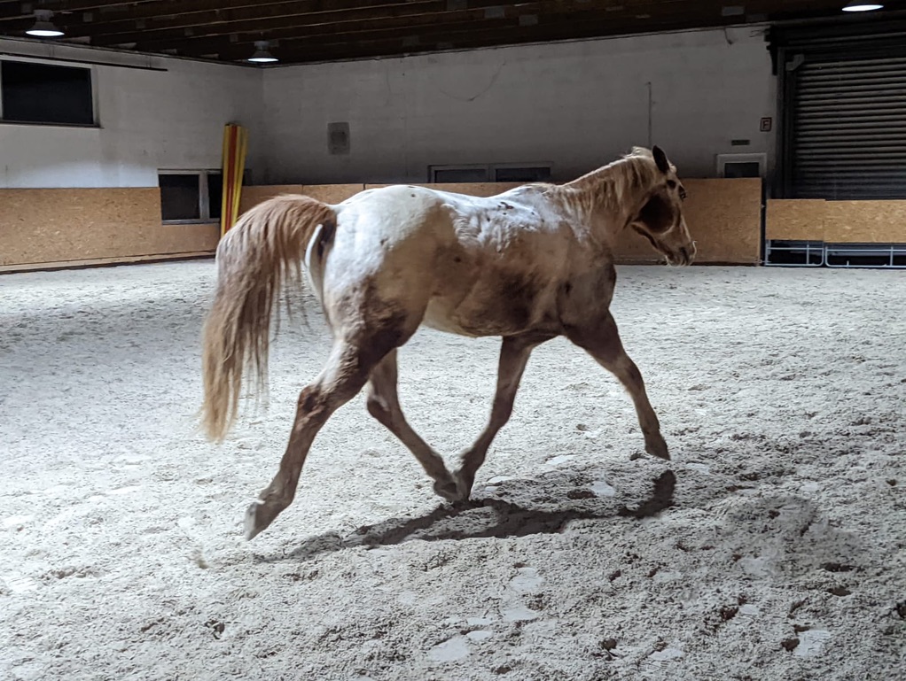 Ganz so haben wir ihn dann nicht vorgefunden - er war/ist (18.01.2022) deutlich dünner und unbemuskelter, was daran liegt, dass er in den letzten 12 Monaten wenig bis gar nicht geritten wurde und sich wohl auch nicht in dem Herdenverband, in dem er untergebracht war, wohlfühlte.